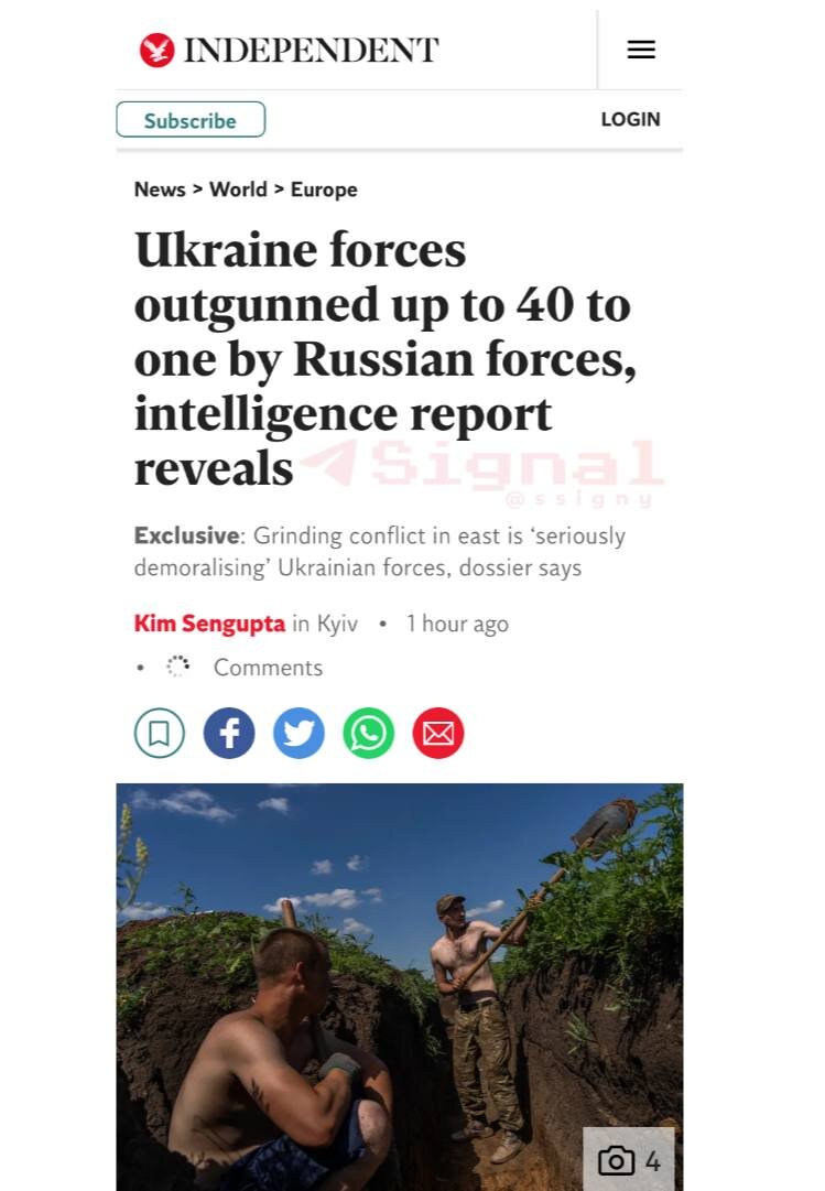Британская Independent со ссылкой на отчет разведки, приводит большую аналитику по соотношению российских и украинских сил. ▪️Украинские войска уступают российским по артиллерии в 20 раз, по боеприпасам в 40 раз, по дальнобойности в 12 раз. ▪️У украинской стороны почти полностью закончились запасы ракет для РСЗО "Смерч" и "Ураган". ▪️У Украины остались РСЗО "Град" и гаубицы, которые бьют максимум на 20-30 км. ▪️Противотанковые "Джавелины" и NLAW были очень полезны в первой фазе войны, полезны они и сейчас, но ими не ударишь по дальнобойной артиллерии противника. ▪️Россияне могут бить по скоплениям украинских войск ракетами с расстояния во многие десятки и даже сотни километров. Наблюдается ситуация "абсолютного неравенства на поле боя, не говоря уже о полном господстве самолетов противника в воздухе". Сбивать российские самолеты и вертолёты удаётся редко. ▪️"Тяжелые бои" оказывают серьезное деморализующее воздействие на украинские войска, в связи с чем растет число случаев дез