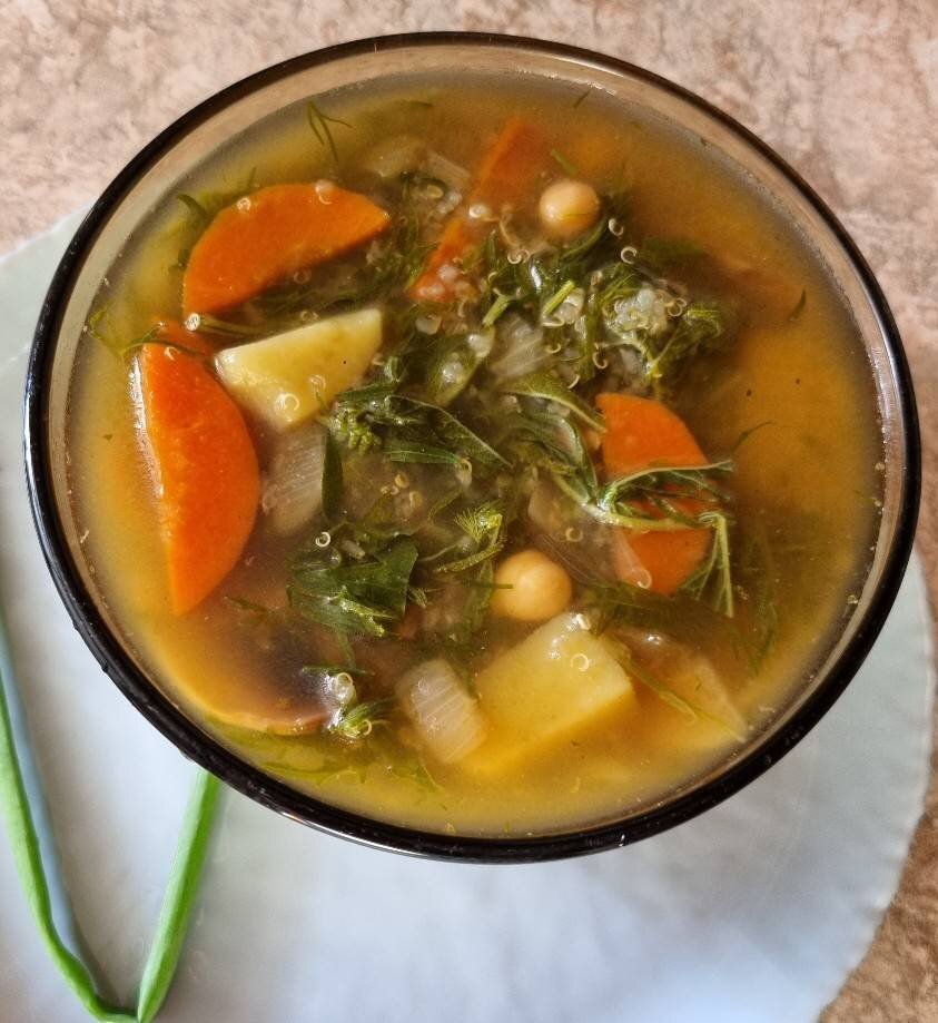 Супы готовлю не часто , но очень люблю густые и наваристые. Так как сейчас сезон крапивы, очень захотелось приготовить такой полезный витаминный суп. #суп #крапива #обед #ужин #киноа #овощи #грибы #веган #веганобед #пп #ппеда #традиции #бикин Ингредиенты: Нут отварной , Киноа сухой вес , Лук , Морковь , Картофель , Крапива, Шампиньоны , Лук зелёный, Укроп, Соль, Перец чёрный, Специи Способ приготовления: Нут и киноа с вечера замочить в воде, утром нут промыть и отварить в течение 1 часа. Я обычно отвариваю всю пачку нута и замораживаю по пакетам. Потом удобно по необходимости всегда можно достать готовый нут для рецепта. Кастрюля у меня 3 литра, наливаю воды 2,5 литра и отправляю туда нут и киноа, закипит и убавляю огонь. Крапиву заливаем горячей водой и даем немного постоять. Пока кипит в кастрюле делаем зажарку. Лук, морковь и грибы режем и отправляем на сковородку с растительным маслом. Жарим на медленном огне до золотистого цвета. Даем бобовым покипеть 20 минут, режем картофель, кр