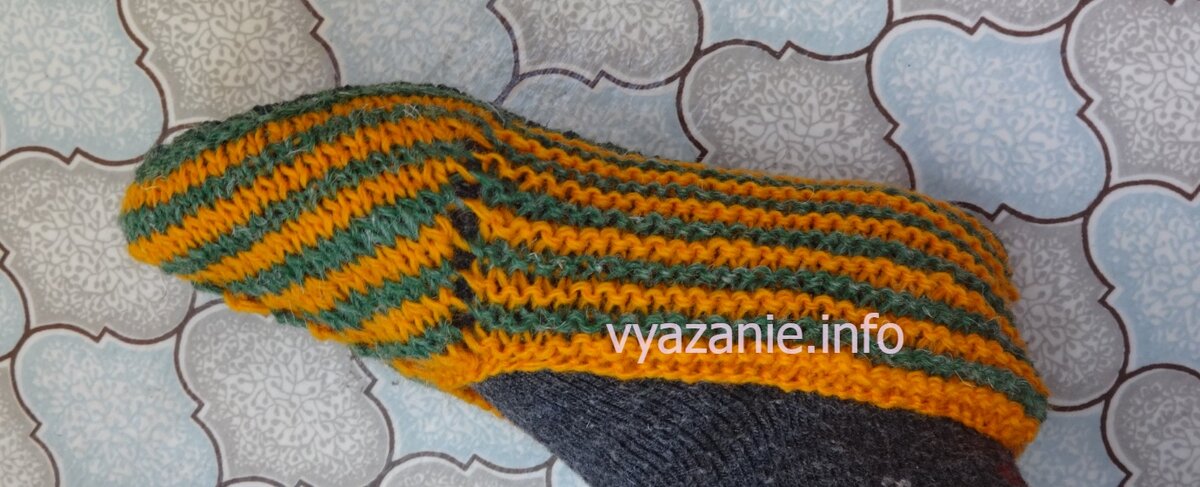 Простые, удобные, яркие, тёплые следки с укрепленной подошвой. Удобнее всего их вязать на круговых спицах с длинной леской. У меня спицы №3 длиной 80 см. Пряжа рассказовская ангора двух цветов и носочная добавка. Ярко жёлтый (цвет ноготки) так красиво оттеняет зелёный! Отдельно зелёный в носках смотрится блекло. Описание. Как связать следки. На спицу №4 набираем 67 петель нитью жёлтого цвета. Вязать будем по 2 ряда каждым цветом. Последнюю петлю во втором ряду вяжем новым цветом. 1 ряд. Развешиваем маркеры (М1 и М2). Кромочные в начале ряда переснимаем, в конце ряда вяжем лицевой. 30 лицевых, М1, 7 лицевых, М2, 30 лицевых. Дальше постоянно до первого маркера будем вязать лицевые петли, между маркерами лицевую гладь, после второго маркера опять лицевые петли. Маркеры просто перекидываем с левой спицы на правую. 2 ряд. 30 лицевых, М, накид, 3 изнаночные, накид, 1 изнаночная, накид, 3 изнаночные, накид, М, 30 лицевых. 3 ряд. Зелёная нить. Все петли лицевые. Накиды вяжем, если нужны дыро