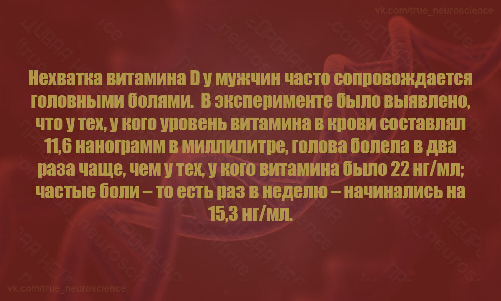Экспериментально было выявлено, что при уровне витамина в крови 11,6 нанограмм в миллилитре головные боли наблюдались вдвое чаще, чем при уровне витамина 22 нг/мл.