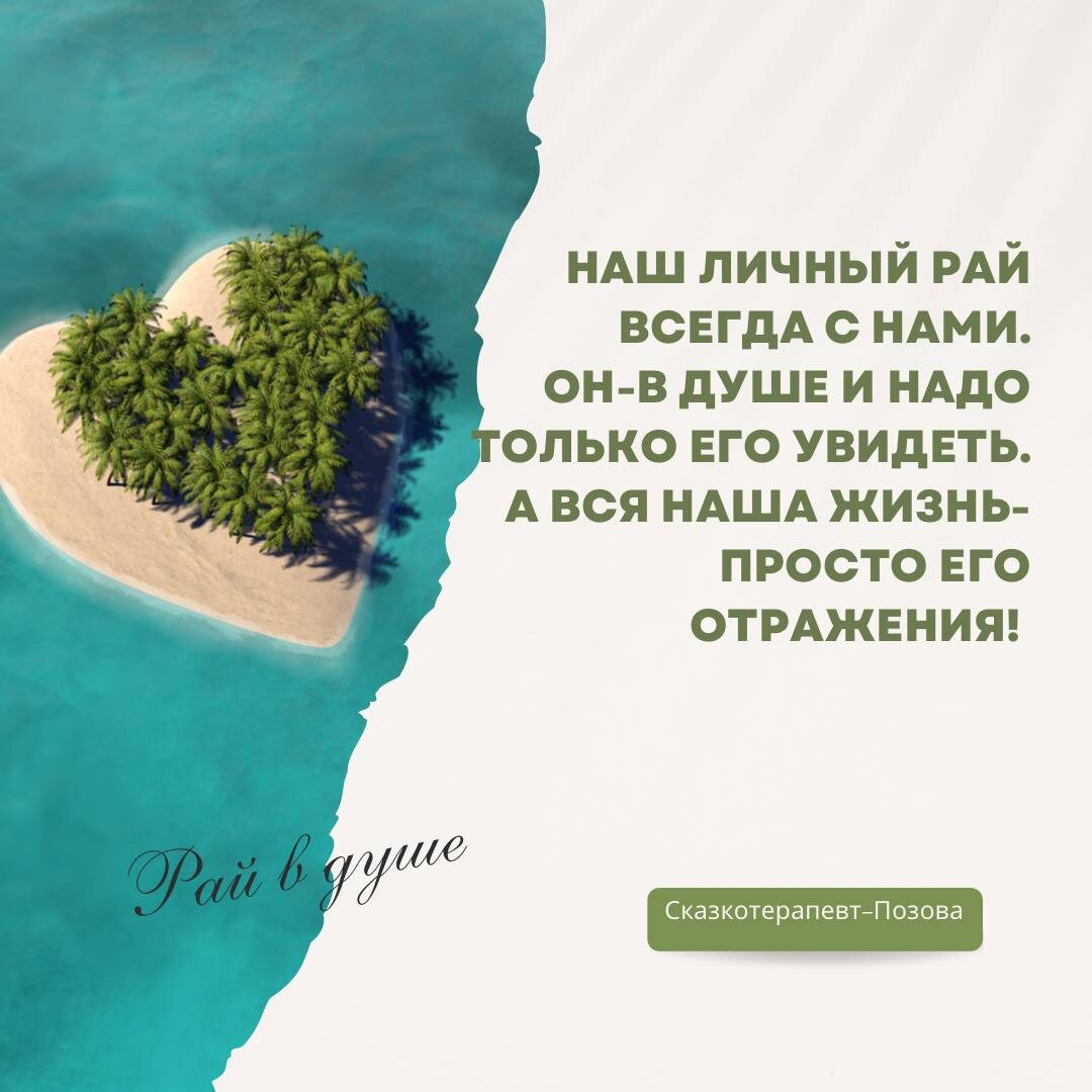 Дорогие мои♥️ Есть на Карте Души совершенно сказочное место, в котором не гремят грозы, не шумят ураганы, не бушуют волны, не свистят ветры. Там всегда светло и покойно, там светит солнышко, поют птицы, цветут яблони, и мирно существуют бог о бок тигр и ягнёнок. Там никто не делит мир на «добро» и «зло», на «чёрное» и «белое», на «хорошо» и «плохо», а принимает все таким, какое оно есть. Рай- это ощущение внутренней гармонии. Рай- это когда наша душа звучит в унисон со Вселенной. Мы все бродим в поисках Потерянного Рая, стремясь обрести гармонию и ощутить себя логичной и важной частичкой целого. Мы бродим даже не подозревая, что эта золотая точка равновесия внутри каждого из нас !!! Рая в Душе♥️