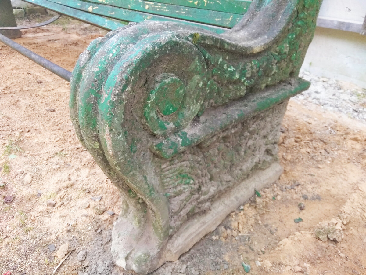 Вот такое сокровище теперь есть у меня на участке. Она конечно же красавица, хотя я в названии взяла это слово в кавычки. Просто прожив лет 70 на этом свете, очень постарела, но думаю, если приложить руки, то она даст фору любой молодой... скамейке. Итак, у меня на участке появилась старая престарая скамейка, видавшая в своей жизни всё. Эти скамейки появились у нас в поселке лет 70 назад точно, стояли в самых красивых местах около клумб, все в зелени. Монолитное сооружение: железобетонные боковины в стиле сталинского классицизма, толстенная труба для связки и плотные (когда-то) доски на сидении. Килограмм триста будет точно. Цвет таких скамеек был преимущественно зеленый, но временами их перекрашивали и в другой цвет. С 90-х годов облагораживание улиц в нашем поселке было запущено, клумб осталось всего три в центре, а скамейки стали разрушаться под воздействием природы и особенно Хомо сапиенса. Одна из нечаянно выживших скамеек очутилась в деревцах, аккурат напротив входа на мою работу