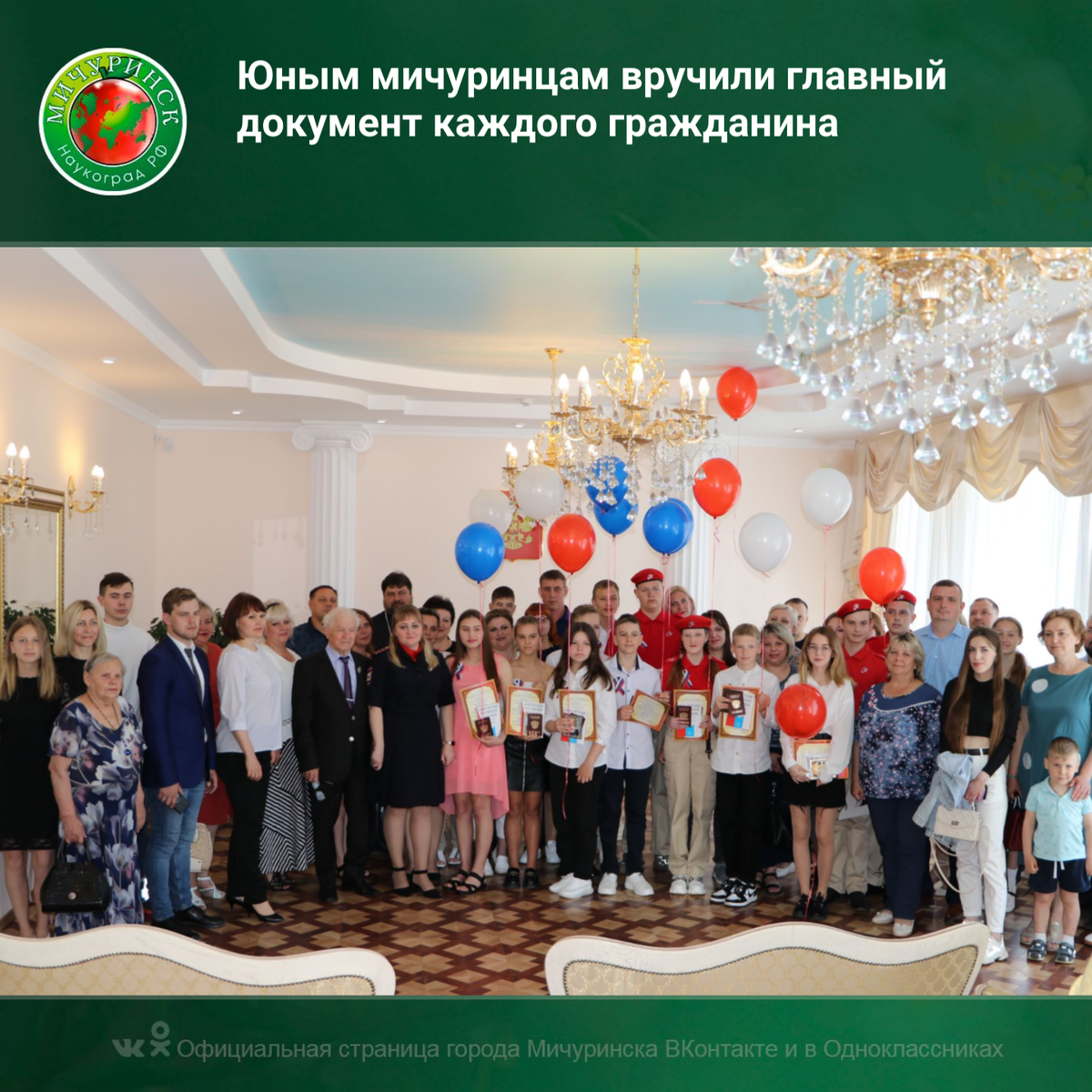В канун Дня независимости России в отделе ЗАГС администрации Мичуринска (начальник Оксана Рогова), состоялось вручение паспортов юным гражданам Мичуринска. Четырнадцать ребят, получили свой первый документ. Среди них - ученики городских школ №5,№15,№18,№8, Мичуринского лицея. Впервые в Мичуринске паспорт гражданина Российской Федерации получила житель Донецкой народной республики. Сотрудники отдела ЗАГС постарались сделать этот день для ребят особенным и запоминающимся. При входе, молодым людям вручались ленты-триколор — патриотический символ неразрывной связи гражданина со своей страной. В зале торжеств царила атмосфера торжественности. По традиции, документ юные граждане получили из рук почетных гостей: заместителя главы администрации Мичуринска Оксаны Мосоловой и начальника отдела по вопросам миграции ОМВД России по Мичуринску капитана полиции Оксаны Щугоревой. Вместе с новым паспортом юным гражданам РФ были вручены брошюры с текстом Конституции РФ, а в качестве сувениров – шары цве