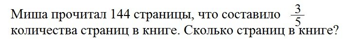 Нахождение числа по заданному значению его дроби Уважаемые мамы и папы, дедушки и бабушки! Предлагаю решение задач 504 и 506 из 7-го издания учебника по математике для 6-го класса авторов А. Г. Мерзляка, В. Б. Полонского и М. С. Якира под редакцией. В. Е Подольского. Условие задачи 504: Решение: Ученики пятого класса при решении этой задачи сперва поделят 144 на 3, чтобы найти одну пятую всех страниц в книге, а затем умножат результат на 5, то есть: 1) 144 : 3 = 48 – страниц в книге составляют одну пятую часть 2) 48 * 5 = 240 – страниц в книге Но этот ответ можно найти и другим путём – используя правило нахождения числа по заданному значению его дроби, которое ученики 6-го класса проходят в §15 учебника: Чтобы найти число по заданному значению его дроби, можно данное значение разделить на эту дробь. То есть решаем задачу, применяя правило деления дробей: Ответ: в книге 240 страниц. Условие задачи 506: Чему равно расстояние между двумя городами, если 36 км составляют 15% этого расстоян