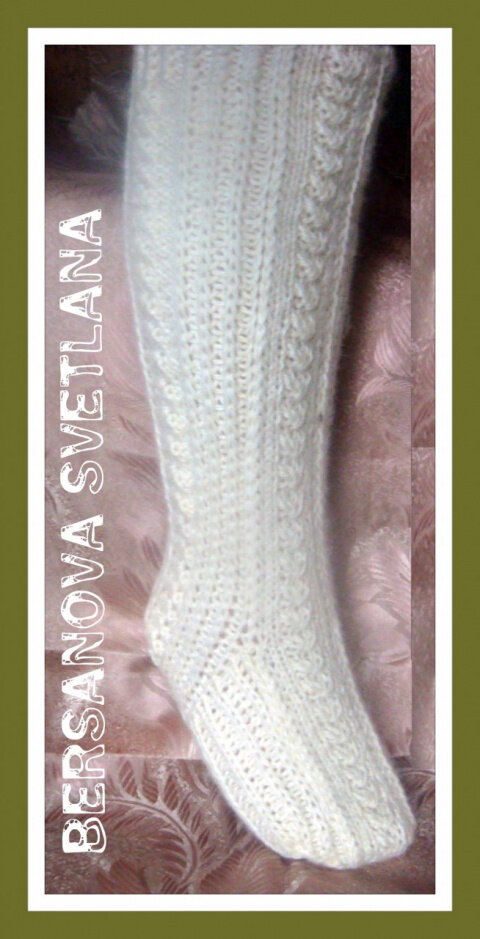 Вязала из пряжи - шерсть трехслойная кавказская Описание: набрать на спицы 44 петли и вязать объемной резинкой 5 рядов по лицевой стороне. Затем вязать узор как показано на видео. провязать узором ГУСИННАЯ ЛАПКА 15 элементов вверх, после этого убавить 6 петель, провязать еще два узора и убавить еще 6 петель и вязать до пятки так, чтобы узоров ГУСИННАЯ ЛАПКА получилось 24. Затем вывязать пятку. Количество петель на подошве 29. Вязать до мыска. Убавлять с двух сторон по одной петле в каждом втором ряду, считая изнаночный. Когда на спицах останется 9 петель начать присоединять к боковым сторонам гольф. Вязать до верха, закрыть петли. #вязание спицами , #вязаные носки , #вязаные гольфы спицами