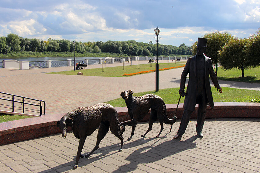 Есть на набережной реки Сож, что в Гомеле, одна интереснейшая скульптура. Казалось бы, ничего особенного - мужчина и две его собаки. Но мы же не просто смотрим на бронзовые изваяния, а стараемся узнать их историю. Итак, мужчина в цилиндре - это последний хозяин усадьбы - Федор Паскевич. Две собаки рядом с ним - борзые Лорд и Марко. Да-да, эти собаки имеют конкретное имя и даже конкретных персонажей в прошлом. Дело в том, что Федор Иванович очень увлекался охотой и имел у себя трех собак - Лорда, Марко и Плутона. После гибели любимых питомцев их было приказано захоронить на территории парка. А над могилами поставить памятные камни. Так, если подняться от Лебяжьего пруда, то на высоком склоне можно эти памятные камни и увидеть. Сегодня их два и на них действительно высечены имена Лорда и Марко. Говорят, что и третий камень был, но после войны исчез. Именно под третьим камнем и был захоронен третий пес князя - Плутон. Хотя, может и не было третьего камня вовсе. По крайне мере, очень мало