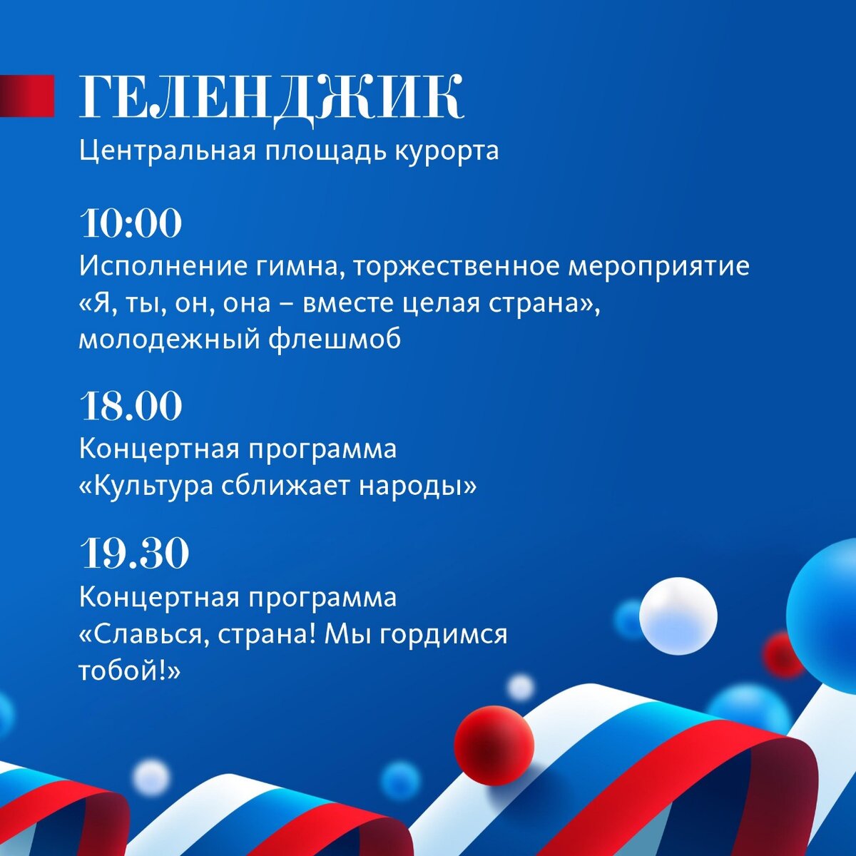 Уважаемые жители Геленджика и округов! 12 июня мы отметим один из самых важных праздников для всей нашей страны – День России. В Геленджике, как и во внутригородских округах пройдут праздничные мероприятия. Приглашаем геленджичан и гостей нашего курорта принять участие в празднике. #геленджик #ДеньРоссии #МойГеленджик #МояРоссияМояКубань #прессслужбагеленджика