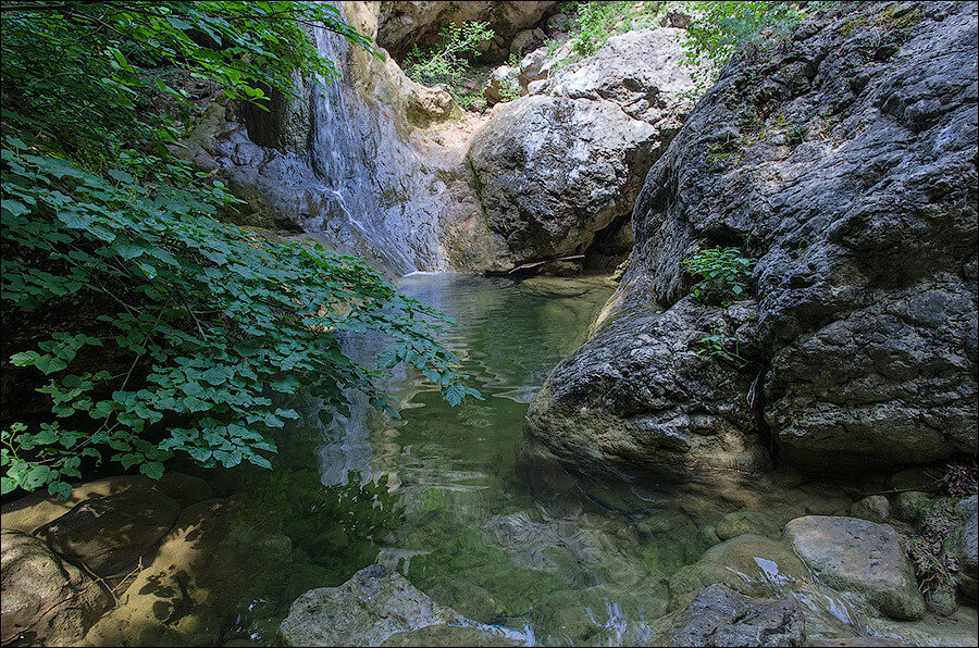 Саша обещал нам купание, и эта перспектива казалась очень заманчивой. От села к водопаду ведёт живописная тропа. Вначале она идёт вдоль русла, а потом ползёт вверх по правому склону ущелья, где узкой лентой втискивается и врезается в скальный склон. Крутые и ступенчатые склоны гор Кара-Даг и Хазанджих сложены красно-бурыми известняками и конгломератами. Множество уступов, проглядываются и сверкают в лучах солнца сквозь темно-зелёные кущи можжевелового леса. День был жарким, вода манила. Купальных костюмов мы, правда, не захватили — кто ж знал? Но Саша посмеялся: какие купальники, вы же не на пляже! И мы с радостью согласились с таким подходом. И когда дошли до водопада в глубине тенистого ущелья, с удовольствием бухнулись в прохладную, солнечно-прозрачную воду речки.