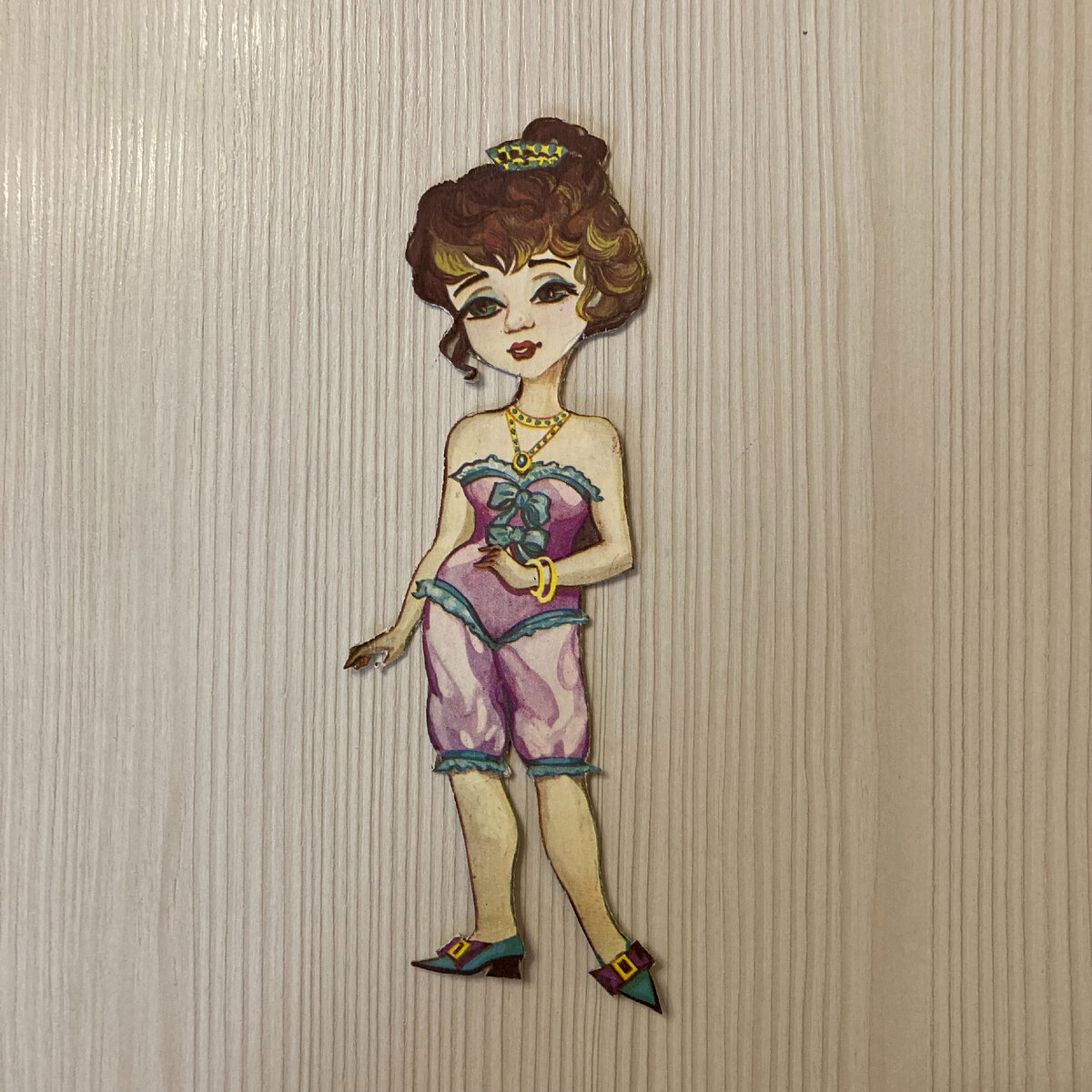Сегодня моя сотая публикация на Дзене (даже не верится!), и мне хотелось показать вам что-нибудь особенное. И решила я показать вам Машу. Маша - девица нежная, томная и мечтательная. Выпущена она была где-то в 90-х, но, насколько я понимаю, в продаже ее не было, ее распространяла некая Украинско-сибирская страховая компания, предположительно, как подарок клиентам. Мне повезло ее приобрести совсем недавно. Упакована Маша была вот в такой картонный конверт, который при раскладывании превращался в фон-декорацию. К Маше прилагается десять нарядов, один другого краше. Они соответствуют совершенно разным эпохам. Вот в этом черном платье и цилиндре Маша напоминает мне девушек с картин Брюллова: А вот здесь - звезду немого кино. Фасоны самые различные: тут и кринолин, и фижмы, и завышенная талия времен ампира... (листайте!) Обратите внимание на головные уборы, они все тоже очень разные. И несколько более простых, но от того не менее эффектных силуэтов: Мне очень нравится наряд с голубым платко