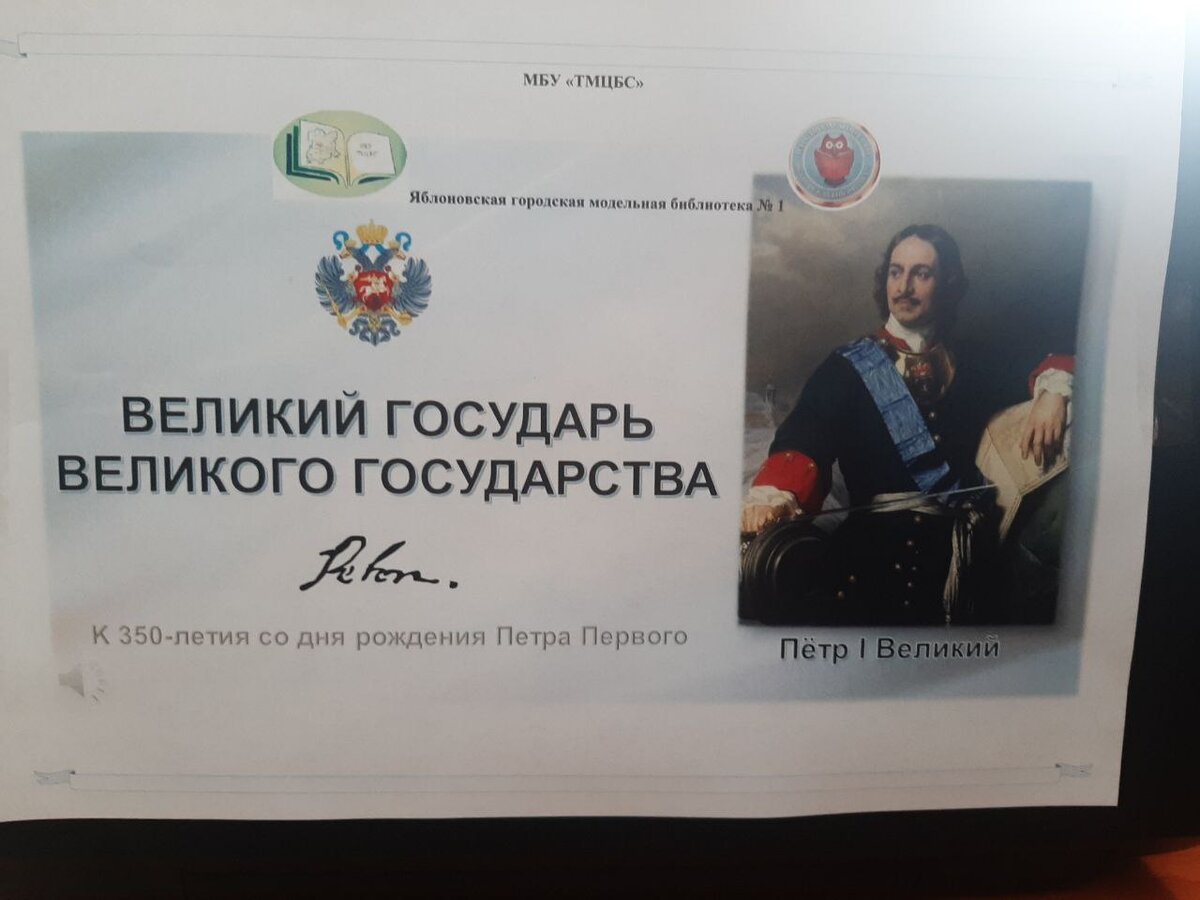 9 июня исполнилось 350 лет со дня рождения Петра Первого. В ознаменование этой даты в Яблоновской городской модельной библиотеке №1 прошло мероприятие «Великий государь великого государства» с выставкой-просмотром и электронной презентацией