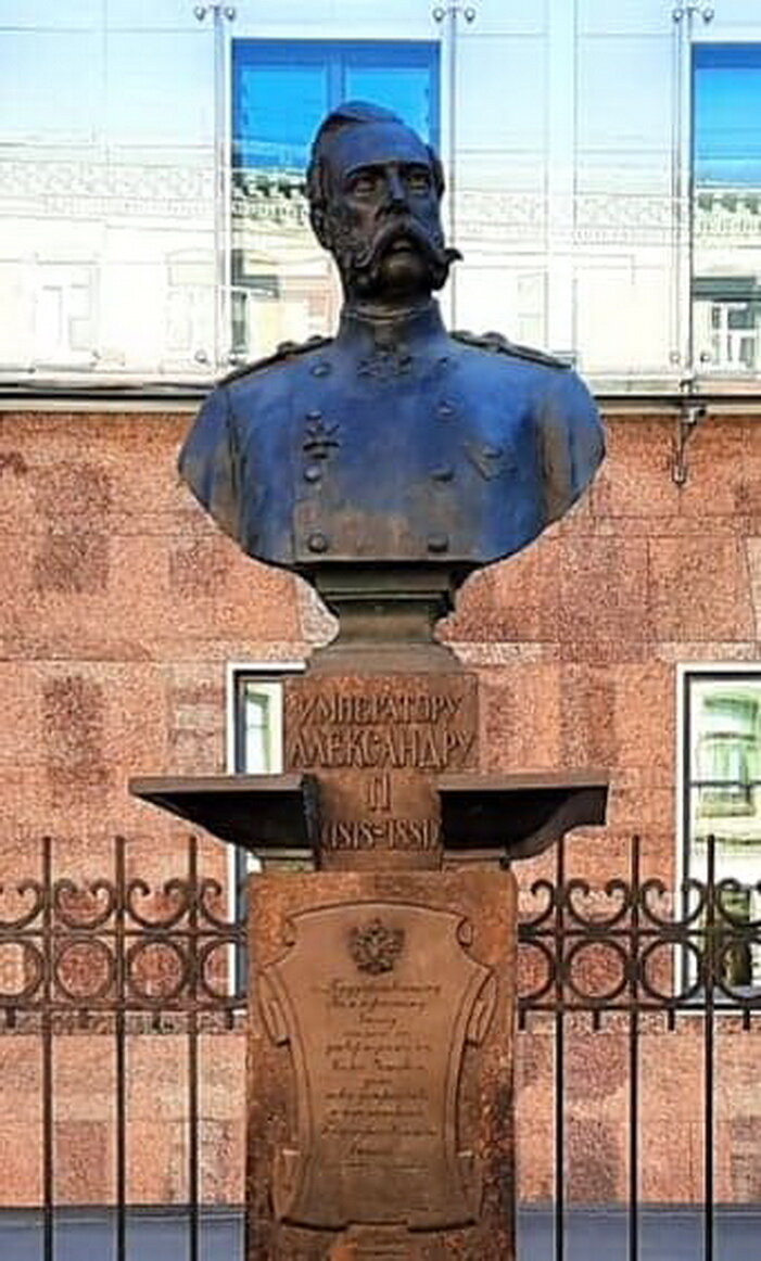 Прогулка по улице Ломоносова ... Памятник императору Александру II у Центробанка Памятник установлен 2005 году, хотя сам бюст отлит ещё до революции. Это копия бюста императора с оригинала скульптуры известного мастера Матвея Чижова, хранящегося в Русском музее. Александр II изображен в классическом образе: Георгиевский крест на мундире, узнаваемые усы и бакенбарды. На бронзовой табличке выбита надпись: «...Государственному Коммерческому Банку согласно с утвержденным Нами Уставом, дать новое устройство и наименование Государственного Банка...» Именно Александр II считается основателем Государственного банка Российской империи (1860 год), от которого ведет свою историю нынешний Центробанк РФ. Материал : Бронза - бюст, гранит - постамент. Высота памятника около 300 см: гранитная стелла - 195 см, Основание бюста - 16 см, бюст 87 см. Остальное это окружение домов этой улицы в центре Сагкт_Петербурга... ****************** ****************** ****************** ******************