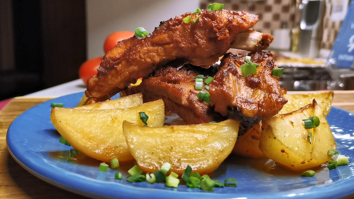 Чаще всего из мяса готовим свиные ребрышки, а гарнир из картошки. Самый простой рецепт, который мы знаем, где все по-простому