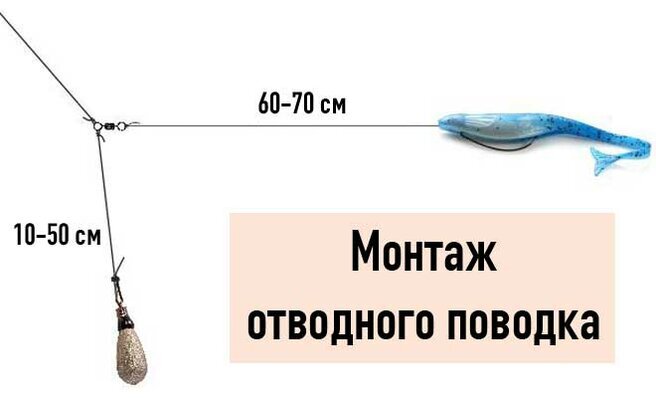 Длина поводка с приманкой может достигать полуметра. Но она также подбирается, исходя из условий. Самая используемая длина поводка в районе 60-70 сантиметров. Приманка будет на достаточно большом расстоянии от груза, и оно не будет отпугивать рыбу от насадки.