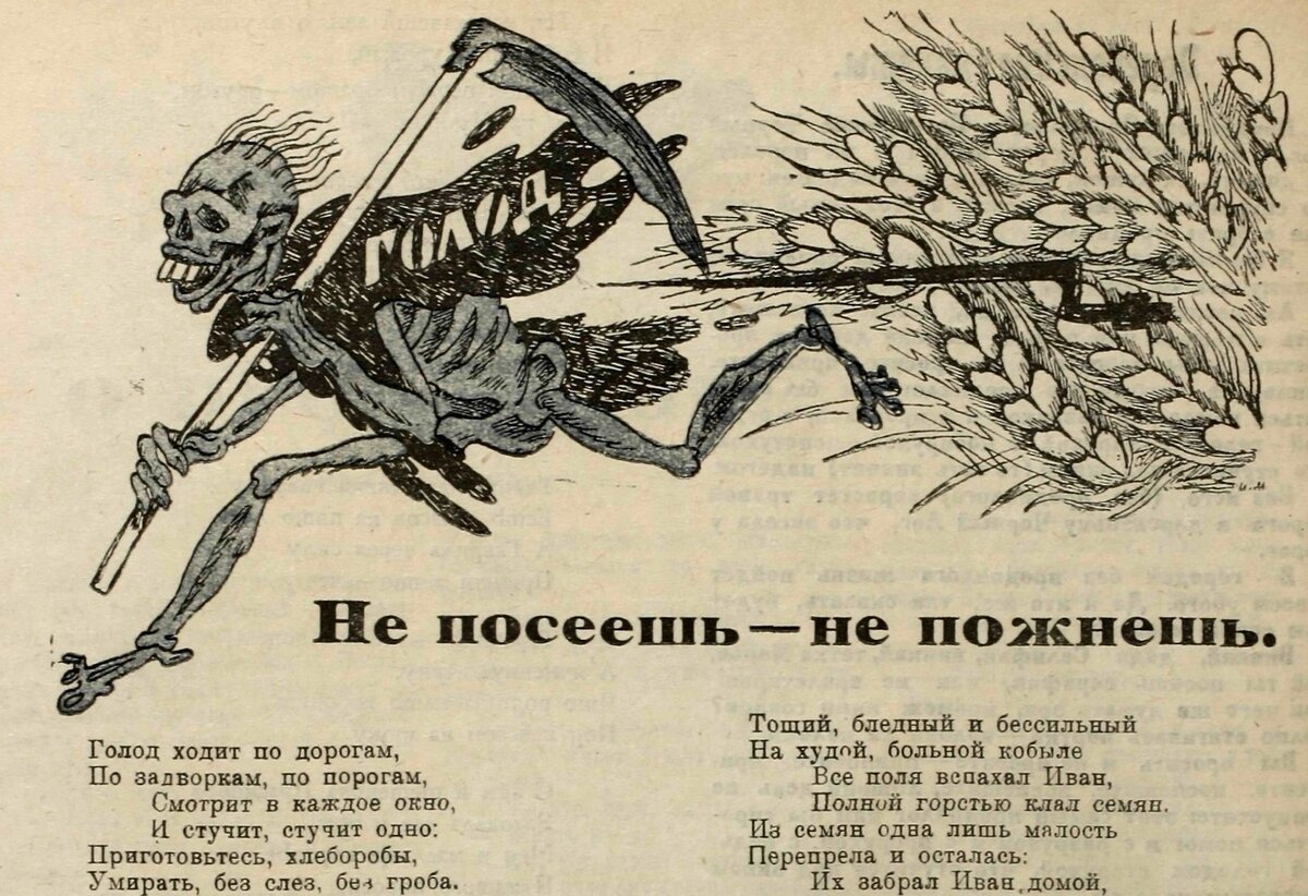 К чему это привело в деревне? К тому, что вторым фактором, спровоцировавшим трагедию, стали сами крестьяне. Селяне резко сократили объемы выращиваемого хлеба. Засеивали столько, сколько нужно самим, своей семье, ну и чуть-чуть сверху, на всякий случай. А то, что в городе хлеба не будет – так это их, городских, проблема. Мне-то упираться какой смысл? Ну выращу я хлеба вдвое больше того, что мне надо, ну изломаю себя работой – а дальше что? Ну дадут мне на рынке за зерно ворох разноцветных бумажек – куда я их дену? Сортир оклею? Мне, конечно, от горожанина много чего хотелось бы получить, но у них же нет ничего! Фабрики все стоят, разруха в стране, торговать нечем.