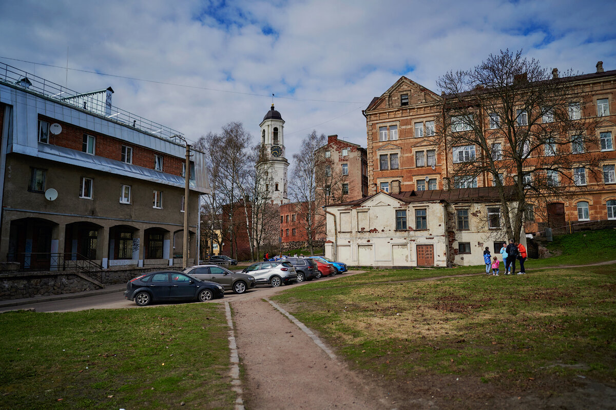 Часовая башня — одна из самых красивых достопримечательностей Выборга и наряду с Выборгским замком является полноправным символом города. Фильм "Земля Санникова" 1973 года снимали в Ленинградской области, на юге страны и даже на Камчатке. Многие сцены снимались в окрестностях Выборга, в том числе эпизод с подъемом Крестовского (Олег Даль) на часовую башню — в самом сердце Выборга. Актеры не поднимались на башню, эту работу выполнили каскадеры, альпинисты Владимир Мясников (дублировал Даля) и Эдуард Часов (дублировал Дворжецкого). Съемки совпали с показом футбольного матча по телевидению, который был сорван из-за того, что пришлось убрать антенны, попадающие в кадр. Жители были возмущены! Вышедшим на улицу недовольным футбольным фанатам выдавали по 100 рублей, чтобы те как-то смирились и не шумели на съемочной площадке. Весьма приличная по тем временам сумма, мне даже как-то не очень верится в эту байку:) По сюжету фильма Крестовский взбирается по стенам башни с завязанными глазами. Дл
