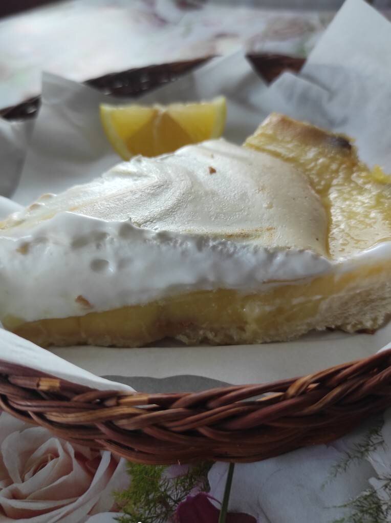 Ингредиенты: Для тіста, вершкового масла, цукрової пудри, борошна, яєчних жовтки, холодної води, солі, Для курда, лимонного соку (це приблизно 3-4 лимони), яйця, яєчних жовтки, цукру, вершкового масла, желатину (швидкорозчиного гранульованого), Для меренги, білки, цукру Способ приготовления: Для основи тарта з'єднайте в мисці 250 г борошна, дрібку солі, 50 г цукрової пудри, 100 г холодного вершкового масла і 2 жовтки. Білки поки залиште, вони знадобляться для приготування меренги. Лимони (3-4 шт.) помийте і розріжте навпіл. Вичавіть лимонний сік, повинно вийти 200 мл.,зробіть це будь-яким зручним для вас способом. Якщо з цієї кількості лимона вийшло недостатньо соку, додайте трохи води до потрібної кількості. Замісіть тісто.Якщо тісто виходить трохи сухим, додайте 2 ст. л. холодної води. Готове тісто сформуйте в кулю, оберніть харчовою плівкою і залиште в холодильнику на 30 хвилин. Розкачайте остигле тісто між двома листами пергаменту в пласт товщиною близько 4 мм. Желатин замочіть у в