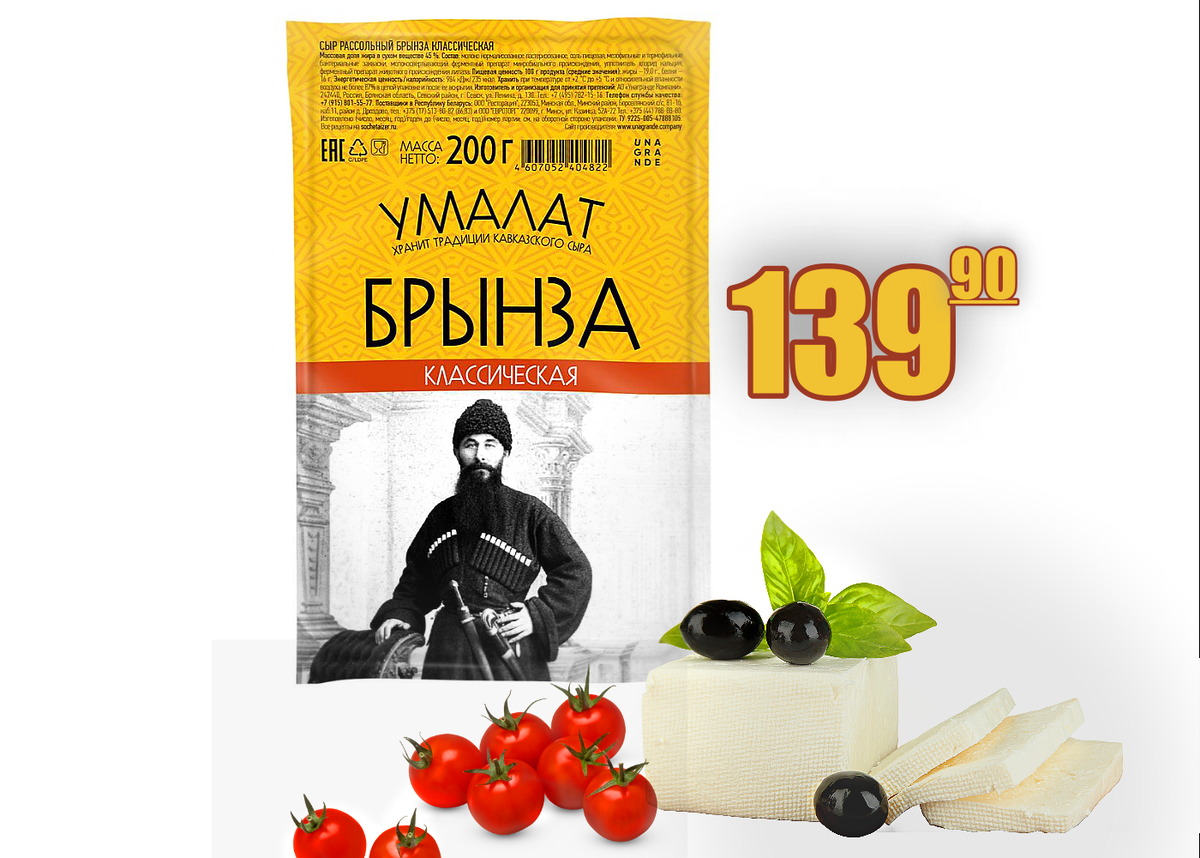 Брынза «Классическая» 45% 200гр ТМ Умалат – 139 руб 90 коп. Брынза - это белый мягкий рассольный сыр, который изготавливают из коровьего молока (также козьего и овечьего). Брынза обладает кисломолочным, ярко выраженным соленым вкусом. Классическая брынза - плотная, ломкая, с небольшим количеством глазков неровной формы. С брынзой готовят горячие блюда, соусы, салаты, закуски, фаршируют овощи, выпекают с брынзой лепешки и пироги (хорошо плавится). Брынза — полезный продукт.