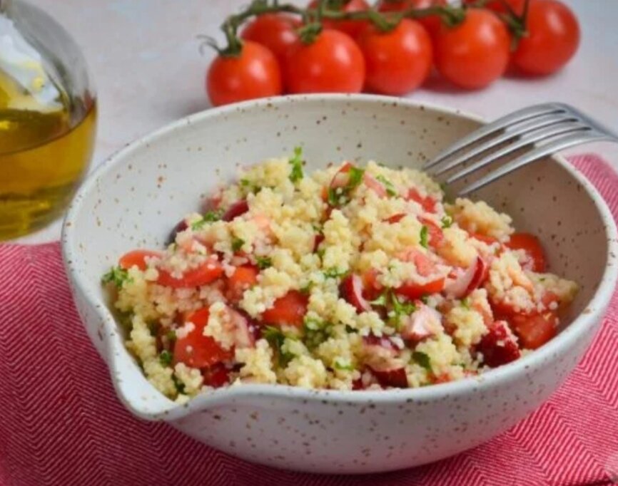 Отличная вариация восточного салата табуле, но с кускусом вместо булгура. А еще предлагаю помимо зелени добавить клюкву или другую кисловатую ягоду. В результате получается очень необычный кулинарный фьюжн. Ингредиенты Кускус – 150 г Помидоры черри – 150 г Петрушка – 1 пучок Клюква – 2 горсти Оливковое масло – 2 ст.л. Лимонный сок – 2 ч.л. Чеснок – 2 зубчика Пошаговый рецепт приготовления 1) Запарьте кускус кипятком в пропорции 1:2 на 5-7 минут. 2) Мелко нарежьте помидоры, зелень и чеснок. 3) Перемешайте салат и добавьте клюкву. 4) Заправьте салат оливковым маслом и лимонным соком. Не забудь поставить 👍 и подписаться. Тебе не сложно, а мне приятно😉🤗
