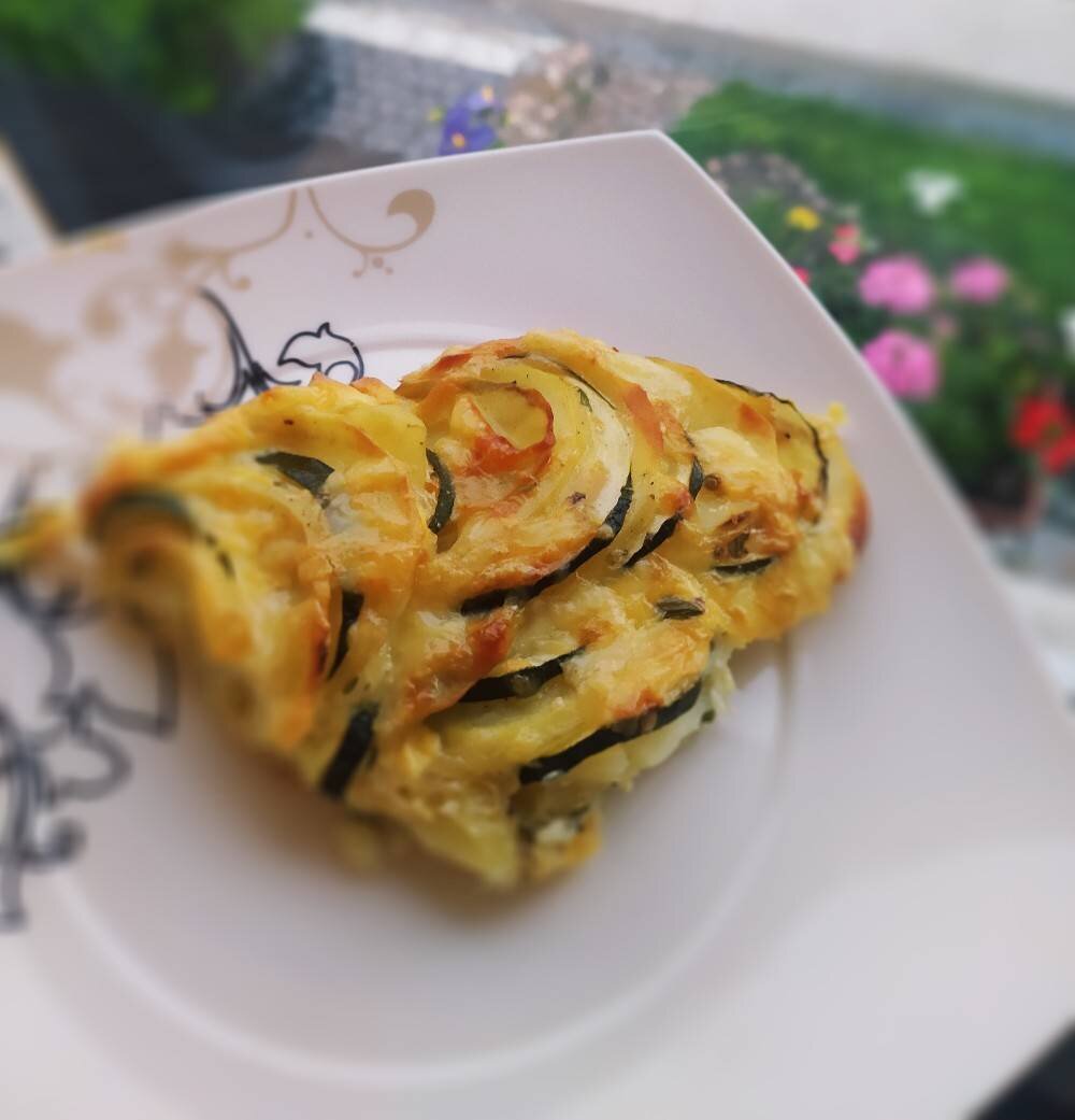 Ингредиенты: крупных картофеля, зелёные цукинии, яйца, сливок, гр Ферментного сыра, гр твердого, Соль, перец, куркума, сушеный базилик