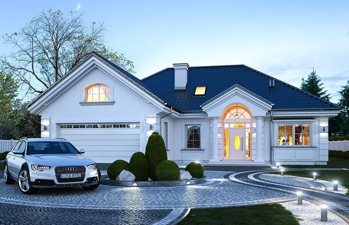 Представляем проект одноэтажного дома с чердаком, рассчитанный на семью из 3-6 человек. Полезная площадь дома - 121,67 м2 Здание имеет прямоугольный корпус, который покрыт четырехскатной крышей. Угол наклона крыши составляет 35 градусов. Со стороны входа пристроен гараж. Лицевая сторона дома напоминает американские особняки из богатых пригородов. Дом украшен красивым навесом с колоннами, это центральный элемент фасада, который фокусирует все внимание. Аналогично со стороны сада основным элементом, украшающим фасад, является навес над террасой и большое окно из гостиной. Архитектура дома наполнена классическими, но приглушенными деталями, что создает элегантный дом с вневременным внешним видом. Интерьер В дом мы входим через удобный коридор с увеличенным потолком. Попадаем в открытое жилое пространство, которое состоит из: гостиной, столовой, кухни с кладовой. В ночной части дома располагаются три спальни, туалет и ванная комната. Детские спальни имеют встроенные шкафы. Спальня родит