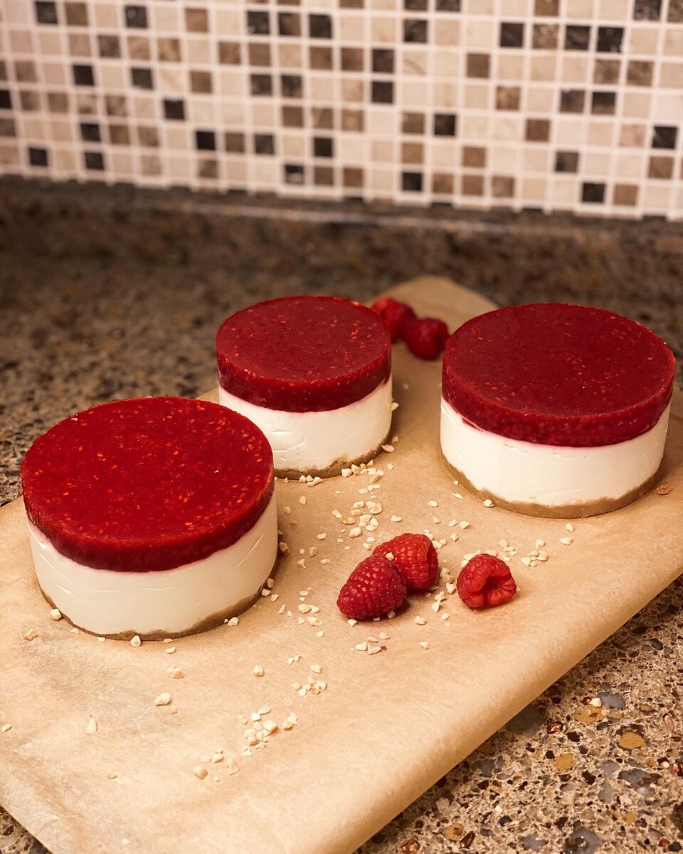 Диаметр одного десерта 8 см На 5-6 десертов Основа: •150 гр песочного печенья •75 гр сливочного масла Мусс: •500 гр сметаны •250 гр творога •50 гр сыра Филадельфия/Креметто •150 гр сахара •1 пакетик ванильного сахара •12 гр желатина на 60 гр воды Малиновое кули: •250 гр малины замороженной •30 гр сахара •7 гр желатина на 40 мл воды Как готовить: 1.Основа: Измельчаем печенье и смешиваем с растопленным маслом в единую массу - раскладываем по формочкам сверху плотно утрамбовывая и закрепляя форму. 2.Мусс: все продукты комнатной температуры смешиваем в однородную массу и выливаем на утрамбованное печенье - распределяя на все десерты (5-6 штук). Ставим в холодильник, чтобы масса схватилась и поверхность стала желейно-твёрдой. 3.Малиновое кули: измельчаем в блендере малину, добавляем к ней сахар и ставим кипятиться. Как только закипело, снимаем с огня, даём немного остыть, чтобы пар перестал идти и добавляем желатин. После полного остывания , убеждаемся , что мусс