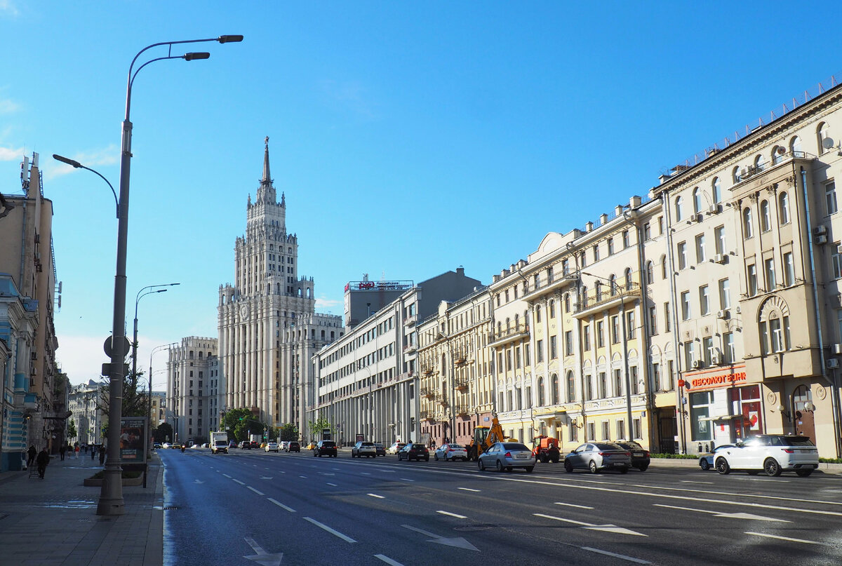 А вот и знаменитый «Дом-паровоз» на Садовой-Черногрязской, построенный как Запасной двор в 1758 году и ставший Зданием Народного комиссариата путей сообщения после масштабной реконструкции в 30-е годы прошлого века. Справа от него − традиционная пробка на Садовом кольце между Курской и Сухаревской.