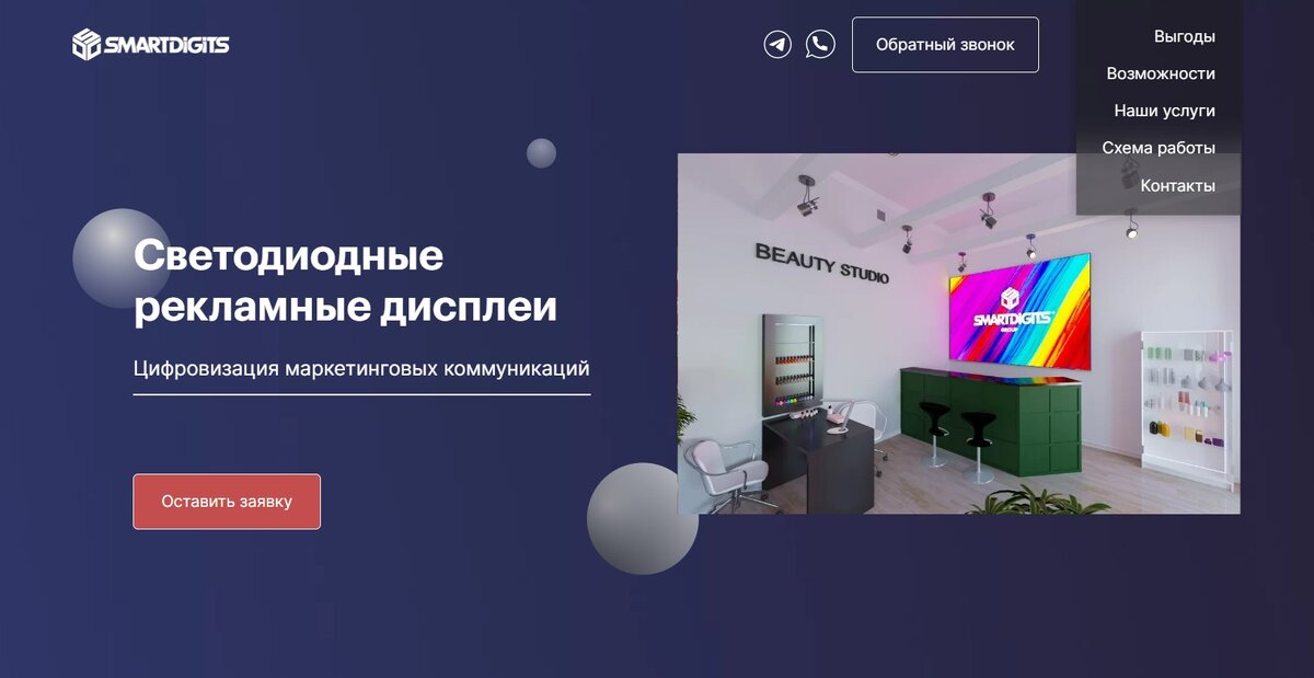 1.1. Ни слово, чем именно занимается компания. Рекламное агентство, которое делает ролики для всех видов рекламных дисплей или поставщик этого самого оборудования для подобной рекламы. При этом ни какой информации (даже ссылки в шапке меню что-то типа «О компании»). Меню слева, перекрывающая изображение — не самый лучший вариант.