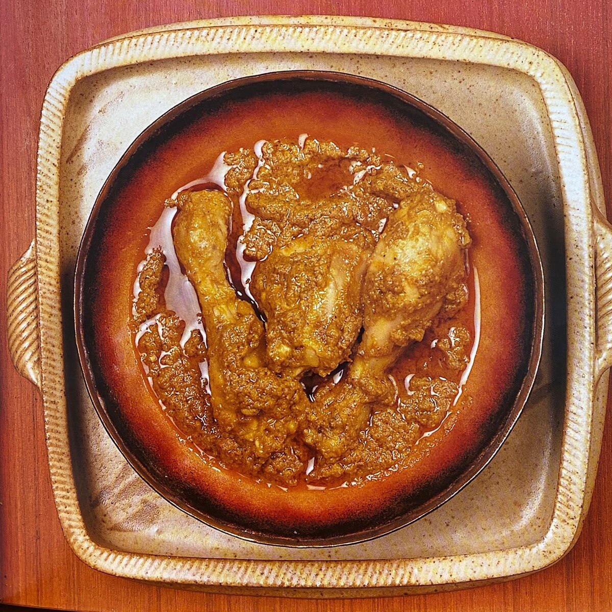Ингредиенты: куриные голени, йогурт, куркума, молотый чили, гарам масала, соль, масло гхи или растительное масло, гвоздика, черный перец, семена мака, кориандр, кумин, репчатый лук, помидоры, листья мяты, корень имбиря, чеснок Рецепт: 4 порции Что понадобится: