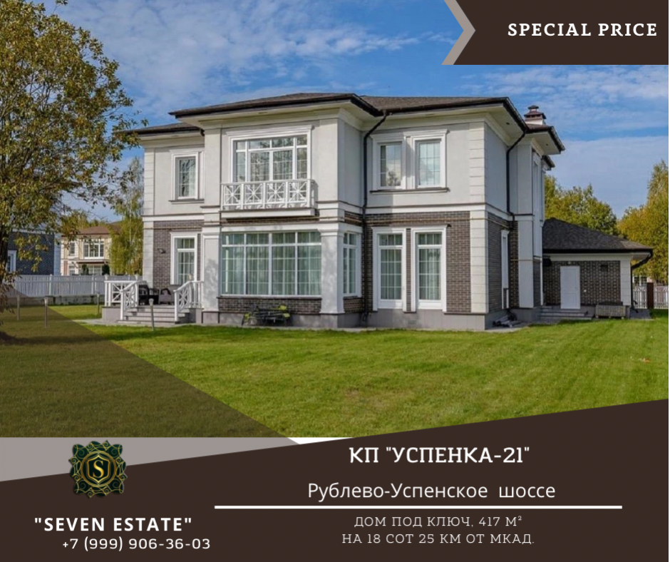 Успенка-21 КП дом под ключ – 417 м2 Расположение: 25 км от МКАД Рублево-Успенское шоссе Стоимость: $ 2 209 492, ₽ 135 000 000 инфраструктура посёлка: Охрана, 8 Га, Полевой, Количество домов 30 Площадь: 417 м² Участок: 18 соток Отделка: Под ключ с мебелью Тип участка: Полевой Коммуникации: Есть Описание Двухэтажный дом в современном стиле, расположен на тихой улице. Здание построено из экологически чистых материалов, предлагается с отделкой и мебелью. Общая площадь усадьбы – 417 кв.м, площадь участка – 18 соток. Гараж на 2 автомобиля. Поэтажное описание 1 этаж: прихожая, гардеробная, кухня, столовая, гостиная, кабинет или кладовая с окном, котельная, прачечная, с/у, 2 террасы, гараж на 2 м/м. 2 этаж: холл, 4 спальни с санузлами и гардеробными. Инфраструктура На территории поселка «Успенка 21» находится 30 загородных домов, построенных в рамках единой архитектурной концепции. В шаговой доступности – смешанный лес, обеспечивающий благоприятный экологический фон. В распоряжении жителей кру