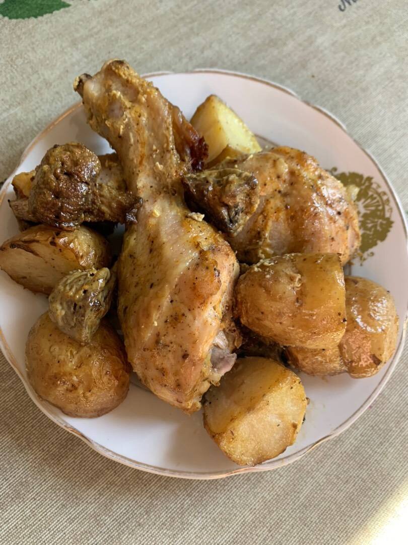 #традиции #Кишинёв Ингредиенты: любого куриного мяса(у меня голени), картофеля, грибов, майонез, специи для курицы-соль,перец,сухая аджика,паприка,куркума,чеснок), специи для картофеля с грибами-соль, перец, куркума Способ приготовления: Смешать несколько ложек майонеза со специями для мяса и замариновать его на час. Картофель и грибы нарезать. Смешиваем майонез и специи для картофеля и грибов. Добавляем в овощи и перемешиваем. Выкладываем на середину противня мясо, вокруг картофель с грибами. Накрываем фольгой и отправляем в разогретую до 180 градусов духовку на 40 минут. Затем фольгу снимаем и запекаем до готовности.