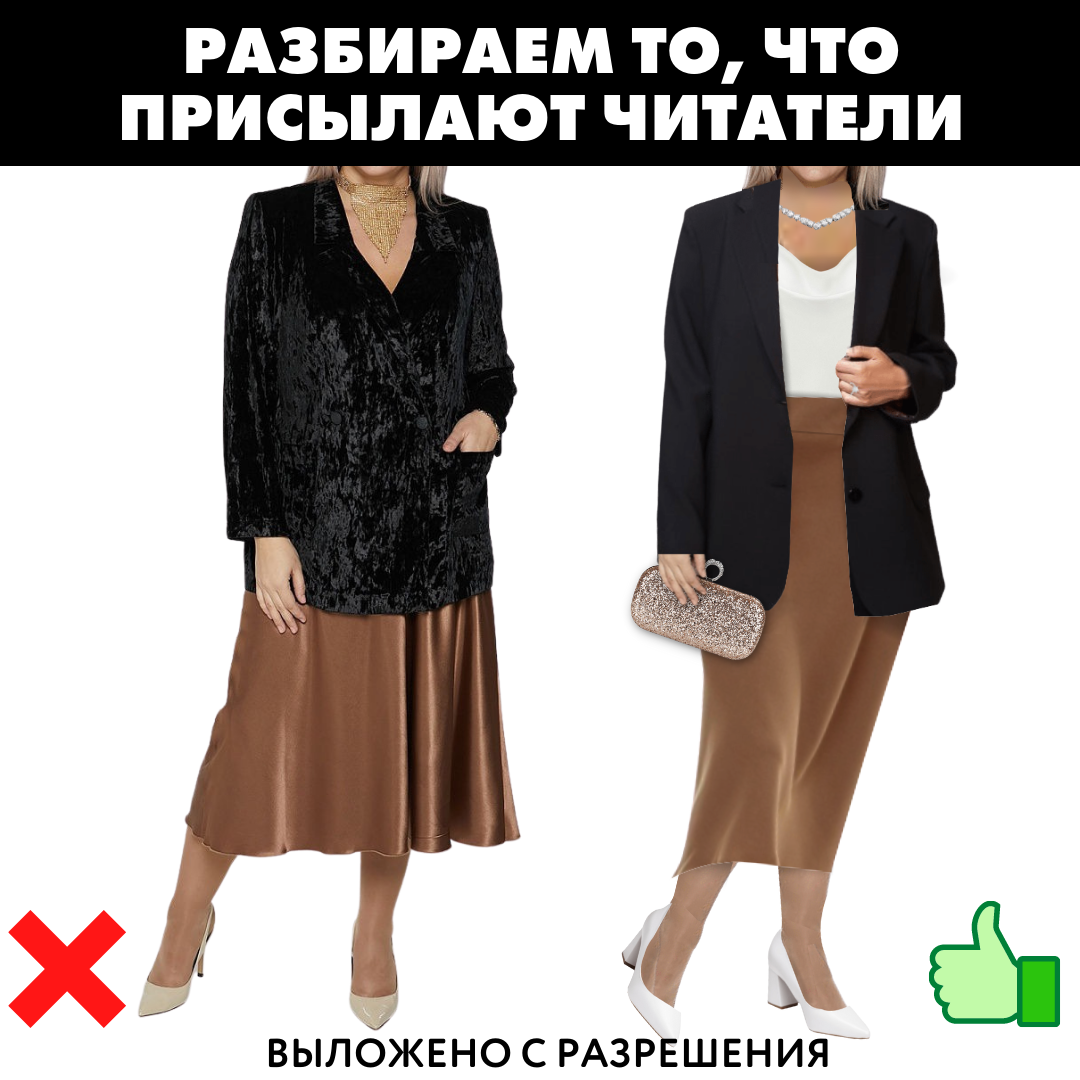 Запрос: собрать образ на день рождения. На фото образ с прошлого праздника, нужно собрать похожий, но с новыми вещами. Вещи попросили такие, которые можно будет потом носить в обычной жизни. И указать все ошибки. 🟠1. Прежде, чем перейдем к разбору каждой вещи отдельно: Обратите внимание на силуэт. Получился прямоугольник без талии, у которого туловище визуально длиннее, чем ноги. А ведь у девушки отличная фигура. Но смотрите, какую диспропорцию и объем создают эти вещи. 🟠2. Анализируем исходный жакет. Не берем такие жакеты. Во-первых, он не держит форму нигде, кроме плеч: тяжелая, тряпкообразная ткань свисает, облегает не там, где надо, туловище сразу становится тяжелым. Усугубляет ситуацию приталенный силуэт. Во-вторых, сама ткань создает сильный информационный шум, от чего эффект тяжести еще больше усиливается. Меняем на лаконичный прямой черный блейзер с четким каркасом, который нам сослужит отличную службу и на празднике, и в обычной жизни. 🟠3. Анализируем исходную юбку. Напом
