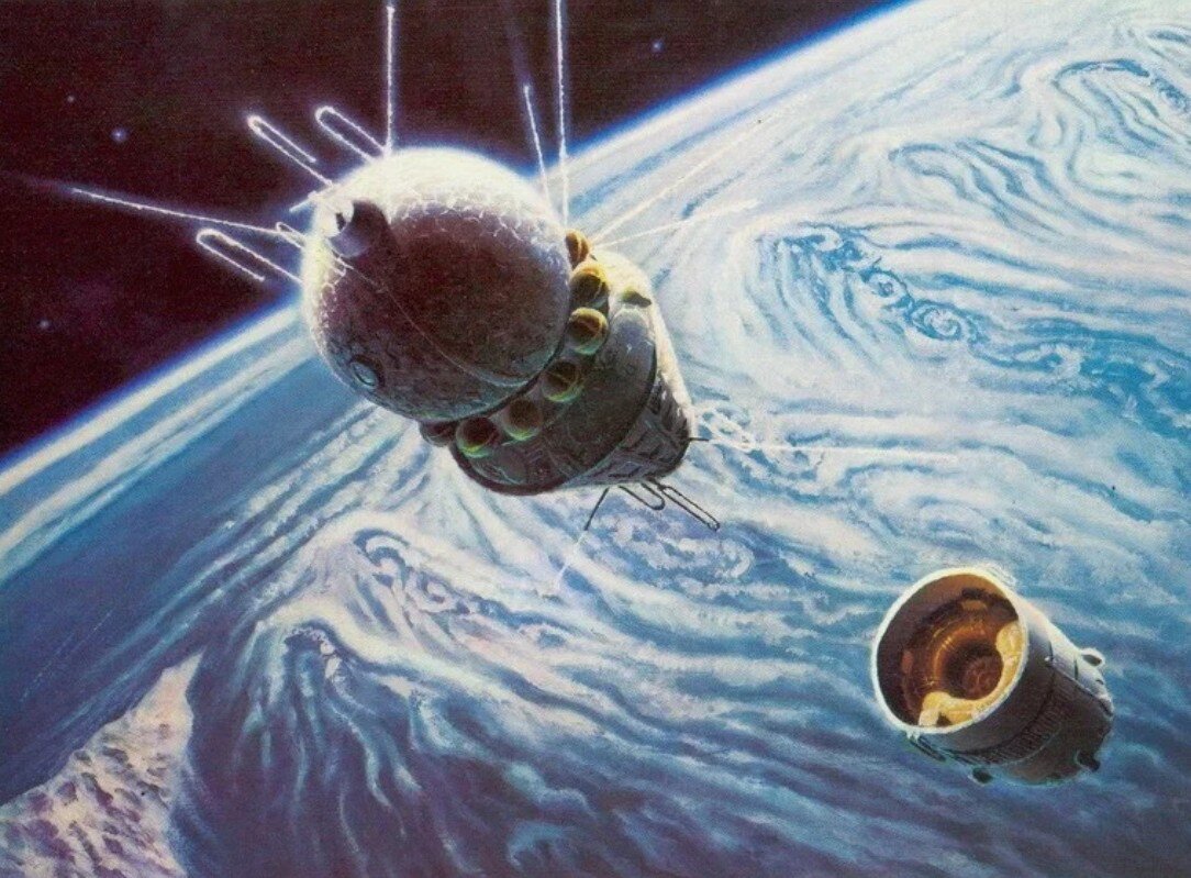 Иллюстрация - репродукция работы советского художника Андрея Соколова, основоположника жанра космической живописи. "Восток" - космический корабль, покидает орбиту, прекращают работу маршевые двигатели. В иллюминаторе уже видна Камчатка, окутанная облаками и гряда Курильских островов. Картина написана совместно с космонавтом А. Леоновым.