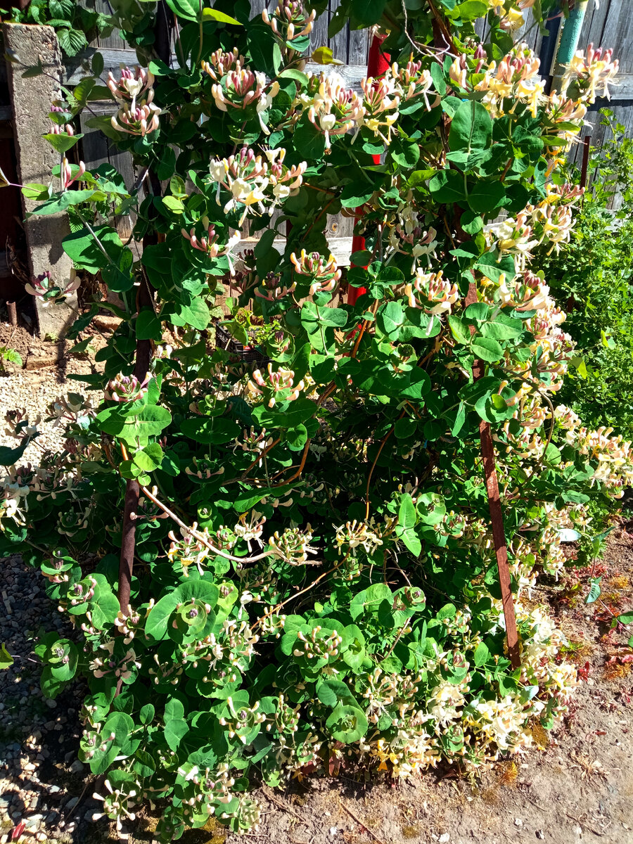 Жимолость каприфоль у меня живёт почти столько же, сколько я живу в этом доме. Поэтому я не помню, откуда она взялась. Сначала она росла рядом с бочкой, а бочка стояла на высокой стойке для нагрева. Так вот мы затянули бочку сеткой, и каприфоль всю её заплела, закрыв некрасивый вид. За все годы она подмерзла только один раз, когда морозы под сорок стояли больше месяца. В ту зиму замёрзли все ветки выше снега. Но очень быстро все восстановилось, за одни сезон. Весной всегда что то подсыхает, кончики длинных побегов нужно стричь, их хорошо видно после распускания листьев. Потом мы начали стройку и каприфоль оказалась не в том месте. Мы решили пересадить её куда нибудь, временно. Пересадили. Там она и осталась, и уже, видимо, на совсем . Поставили ей подпорку из уголка, которую даже покрасить не удосужидись. Сейчас каприфоль не в садовой зоне, а в хозяйственной. Пересаживали мы каприфоль во взрослом возрасте. Да ещё и летом. Для этого обрезали всё длинные побеги, оставили только осно