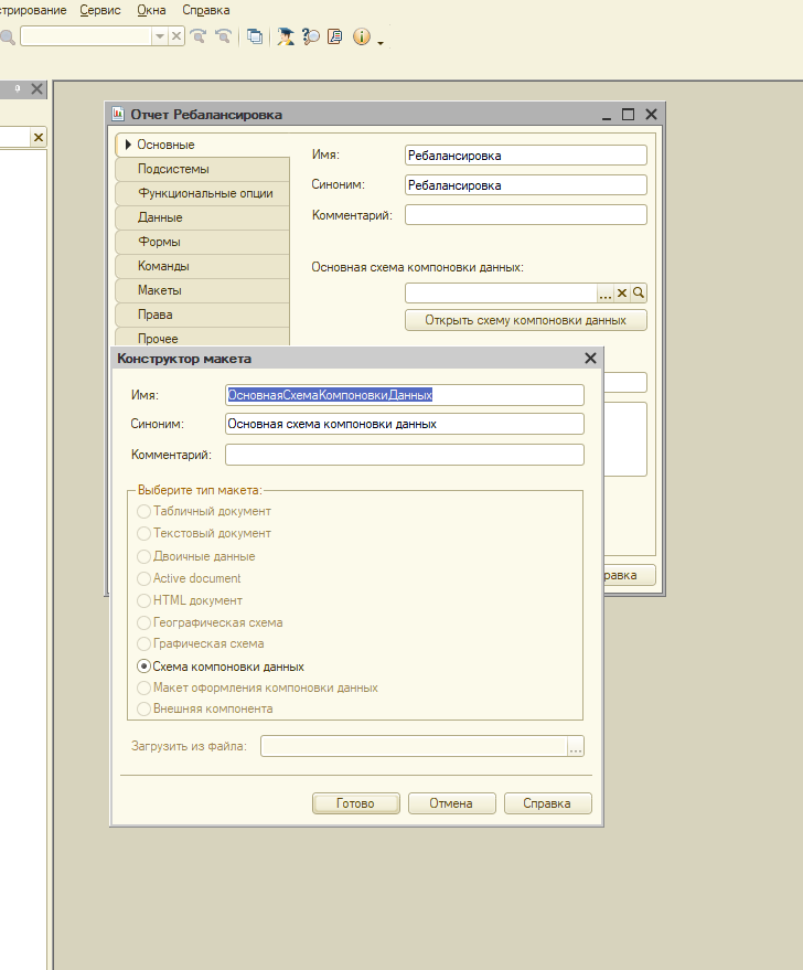 Здравствуйте, дорогие читатели! В предыдущей статье мы создали документ ребалансировки. Сегодня по данному документу мы будем строить отчет. Запустите 1С в режиме конфигуратора. Создайте новый отчет. Назовите его Ребалансировка. Добавьте его в подсистему Отчеты. При нажатии кнопки открытия схемы компоновки данных этого отчета, будет предложено создать новую схему, что нам и надо: Прожимаем Готово и попадаем в конструктор схемы. Так как документов ребалансировки будет несколько, то прежде всего дадим возможность пользователю выбирать необходимую ребалансировку из имеющихся. Для этого перейдем во вкладку параметры. Добавим параметр. Назовем его Документ. Выберем тип: ДокументСсылка - Ребалансировка: Затем перейдем в последнюю вкладку Настройки. Там нас интересует вкладка параметры. Выбрав наш единственный параметр Документ, нажмите его свойства: Отметьте Включать в пользовательские настройки: Теперь при запуске отчета Ребалансировка. Пользователь моет указать документ Ребалансировки