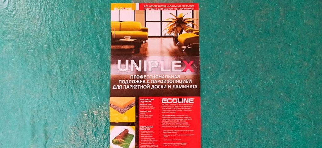- Uniplex Ecoline — хорошо подходит для любых типов оснований, от не очень качественно выровненной цементной стяжки до фанерных полов. Благодаря особенности материала происходит заполнение небольших неровностей, ямок. Плотность войлока высокая, что благотворно влияет на целостность замочного соединения. Высокое ударное шумопоглощение. Тяжело производить нарезку материала, необходимы ножницы.