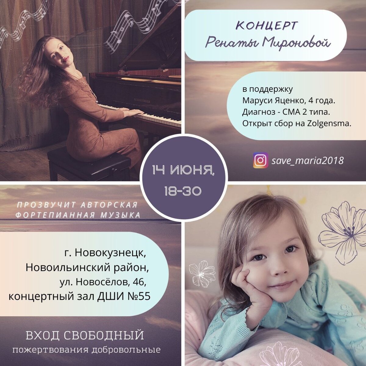 @save_maria2018 14 июня в концертно-выставочном зале ДШИ №55 г. Новокузнецка состоится благотворительный концерт в поддержку Маруси Яценко. Для Вас играет композитор Рената Миронова. ⠀ Рената - лауреат престижных международных конкурсов в номинации «композитор». Пишет музыку с раннего детства. ⠀ Творчество Ренаты - это бесконечная искренность, идущая от сердца к сердцу. Темы любви, материнства, природы, космоса, философии раскрыты в её фортепианных композициях. Проникновенное исполнение Ренаты перенесёт вас в Мир гармонии, красоты и совершенства. ⠀ ВХОД СВОБОДНЫЙ! Пожертвования добровольные ⠀ Все собранные средства будут переданы семье Маруси. ⠀ Дата: 14 июня Время: 18-30 Место: г. Новокузнецк, Новоильинский район, ул. Новосёлов, 46, концертно-выставочный зал ДШИ №55. ⠀ ДО ВСТРЕЧИ! 🎵🎹☀️ ⠀ Помогать легко 👇 ♨️ лайк ♨️ добавить себе в сториз ♨️ отправить репост своим друзьям и знакомым ♨️ Переведи посильную сумму ⠀ 👧🏼Маша Яценко 4 года 💰Сумма сбора = 121 000 000 руб 🆘Собрано - 69 6