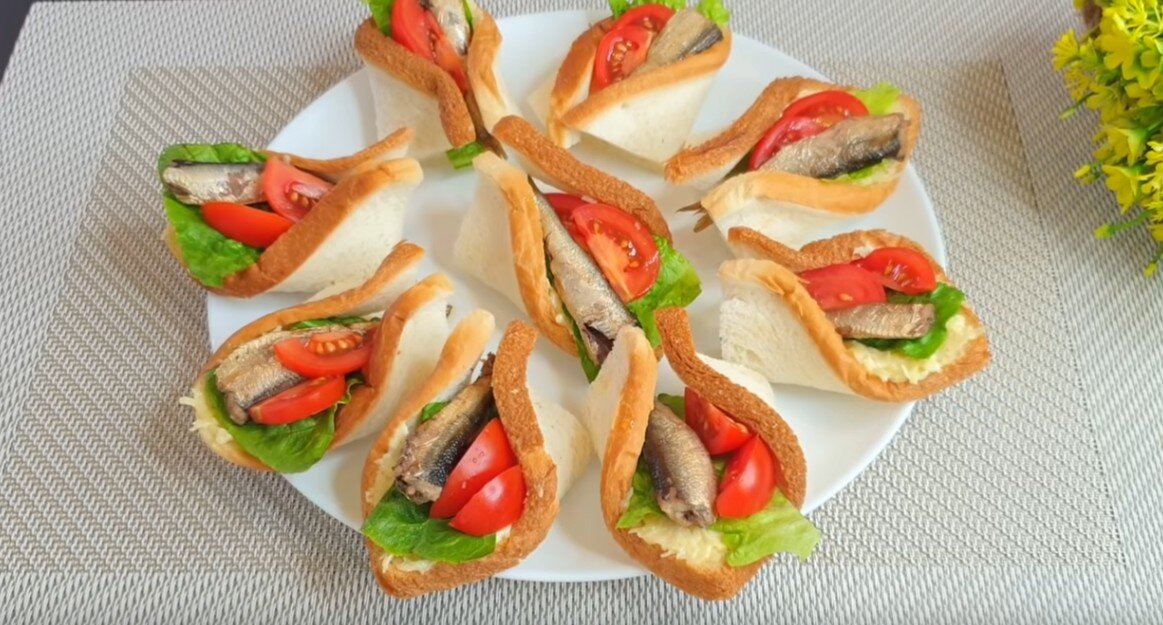 Хочется чего-то необычного? Попробуйте этот рецепт обалденной закуски. А если у Вас намечается праздник, то такая закуска отлично впишется и украсит праздничный стол. Докажет, что ваше кулинарное умение на высоте! Для такой закуски потребуются вполне обычные продукты. Единственное, что нужно поискать, так это хлеб, который используют для тостов. Он должен слегка тянуться. Ну а в остальном, это сыр, помидоры и шпроты. Но обо всем по порядку. Ингредиенты: Американский тостовый хлеб – 6шт; 6 зубочисток; 100 г твердого сыра; 4 ст. л майонеза; Шпроты в масле; Листья салата; Помидоры черри – 4 шт; Долька чеснока. Способ приготовления: 1. Тостовый хлеб слегка раскатываем скалкой, чтобы примять края. Затем каждый квадратный кусок хлеба разрезаем по диагонали на 2 части, формируя треугольники. 2. Затем, подворачиваем противоположные края и фиксируем при помощи зубочистки, нанизывая на неё углы. Так как зубочистка длинная, обламываем половину. Процесс повторяем с остальным хлебом. Готовые фигур