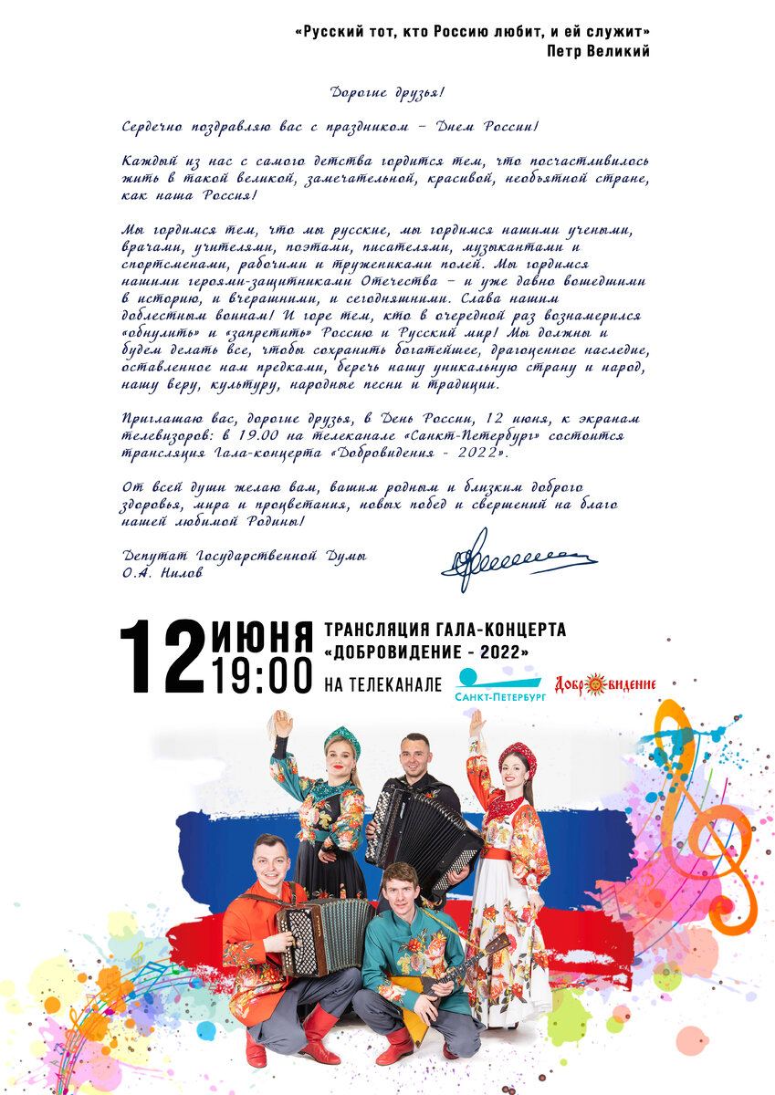 «Русский тот, кто Россию любит, и ей служит» - Петр Великий Дорогие друзья! Сердечно поздравляю вас с праздником – Днем России! Каждый из нас с самого детства гордится тем, что посчастливилось жить в такой великой, замечательной, красивой, необъятной стране, как наша Россия! Мы гордимся тем, что мы русские, мы гордимся нашими учеными, врачами, учителями, поэтами, писателями, музыкантами и спортсменами, рабочими и тружениками полей. Мы гордимся нашими героями-защитниками Отечества – и уже давно вошедшими в историю, и вчерашними, и сегодняшними. Слава нашим доблестным воинам! И горе тем, кто в очередной раз вознамерился «обнулить» и «запретить» Россию и Русский мир! Мы должны и будем делать все, чтобы сохранить богатейшее, драгоценное наследие, оставленное нам предками, беречь нашу уникальную страну и народ, нашу веру, культуру, народные песни и традиции. Приглашаю вас, дорогие друзья, в День России, 12 июня, к экранам телевизоров: в 19.00 на телеканале «Санкт-Петербург» состоится тра