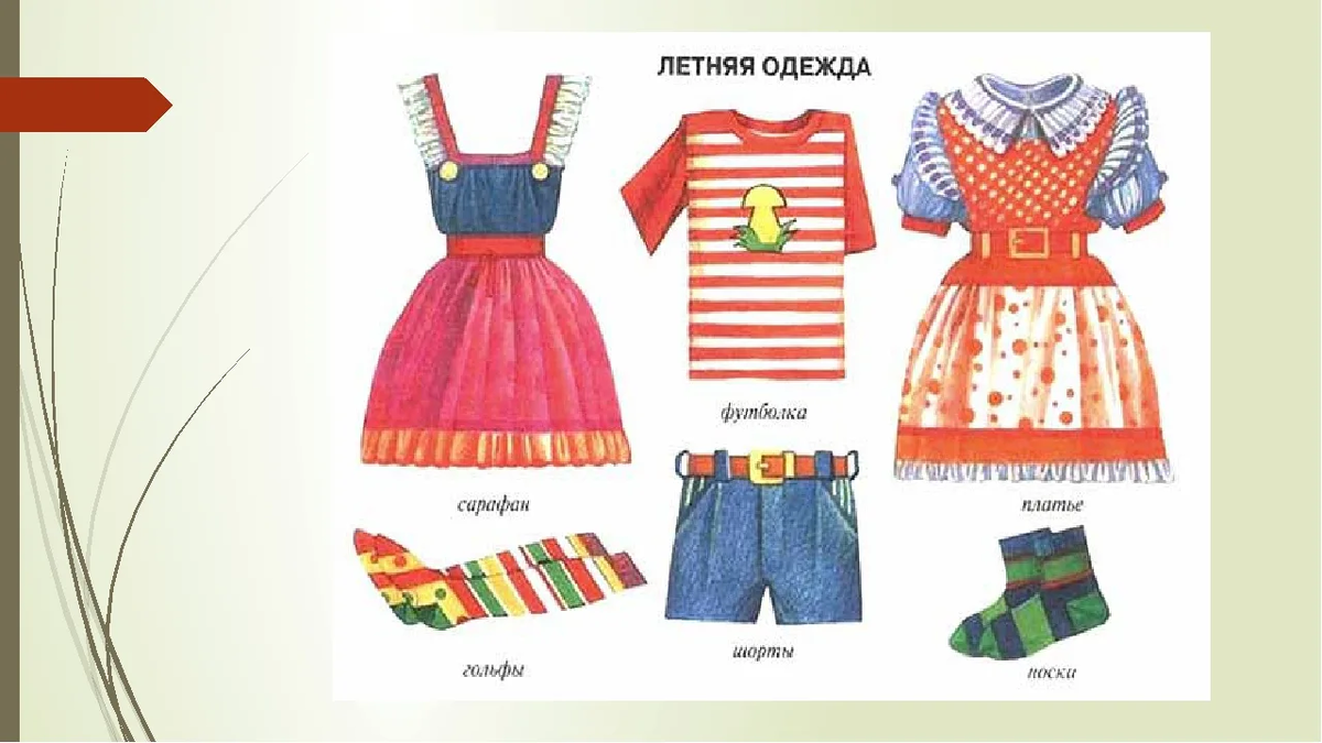 Урок: мир природы и человека Тема: Одежда и занятия детей летом Цель: формирование представления у обучающихся о правильной одежде и занятиях детей летом Задачи: - закрепить представления детей о сезонных явлениях живой и неживой природы, об одежде и занятиях детей летом; - развивать устную речь как средство общения; формировать навыки составления короткого описательного рассказа; - воспитывать любовь к родной природе. Ход урока. Организационный момент Всех жарким солнцем одарило, В цветной наряд луга укрыло, Гулять, купаться позвало, Цветов и ягод принесло. - О каком времени года говорится в стихотворении? - Почему вы так подумали? - Назовите летние месяцы. Игра «Слово на ладошке» - Лето – удивительное, веселое время года. О лете можно сказать много красивых слов, ведь оно бывает разным. А какие слова вы знаете о лете? - Лето, какое? (Разноцветное, долгожданное, жаркое, теплое, солнечное, радостное, веселое). Повторение изученного материала «Признаки лета» - Как много мы сказали краси