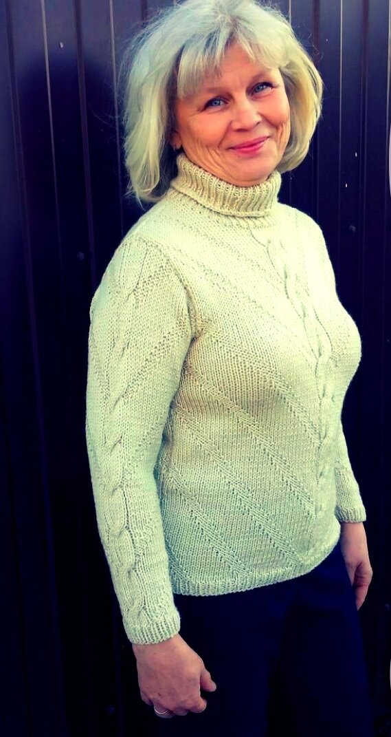 Уже не за горами и холода. Давайте начнем утепляться. Теплый свитер - одна из самых практичных и удобных вещей для осенне-зимне-весеннего периода. Мой свитер связан из толстой нити, но его можно связать и из более тонкой, главное , чтобы в ее составе была шерсть. Для 44 размера потребуется 600 г пряжи 100% шерсть (250 м – 100г). Спицы №4 Перед Набираем 86 петель и вяжем 8 рядов резинкой 1х1, затем вяжем по схеме. На высоте 38 см для проймы закрываем 4,2,1,1 пели в каждом втором ряду с обеих сторон. На высоте 14 см от начала проймы для горловины закрываем средние 16 петель, а затем 3.2.1.1. петли в каждом втором ряду. На высоте 20 см от начала проймы закрываем оставшиеся петли. Спинка Вяжется так же. Но горловину начинаем оформлять на высоте 18 см от начала проймы. Закрываем средние 20 петель и затем, 3,2 петли в каждом втором ряду. Рукава Набираем 44 петли и вяжем 8 рядов резинки 1х1, затем переходим к основному узору. Вяжем 45 см, равномерно прибавляя с обеих сторон по 15 петель,
