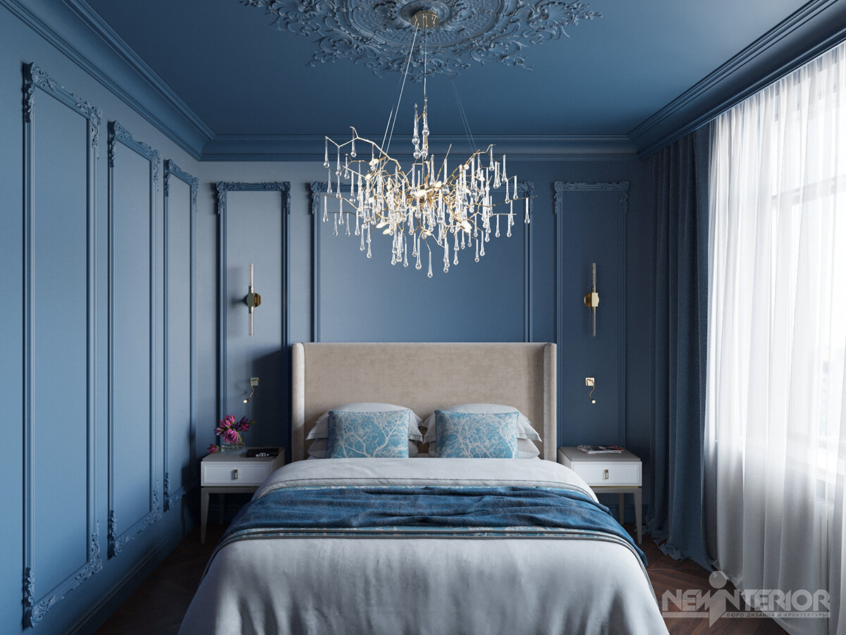 Главной доминантой интерьера этой спальни, конечно, является цвет. Это ещё не согласованная визуализация спальни в нашем проекте интерьера квартиры в ЖК Премьер Палас. На стенах - архитектурные зеркала, выполненные из молдингов с элементами лепнины. На полу - паркет выложенный узором "французская ёлка". Напротив кровати с мягким изголовьем мы расположили комод, кресло в той же обивке, как и изголовье, и композицию из напольных ваз. У входа в комнату разместился витринный шкаф для книг - это пожелание клиентов. И напротив него - скрытая дверь в гардеробную. Изящная люстра, оформленная лепной розеткой на потолке, дополняет дизайн этой спальни. Что скажете про интерьер? Решились бы на такое оформление спальни? Бюро дизайна и архитектуры Ольги Кулекиной