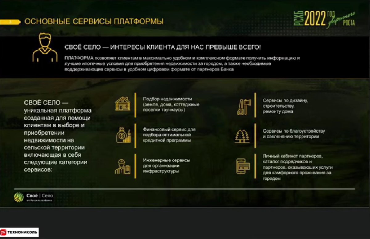 Называется она: "Свое село". На данной платформе собраны все сервисы для решения задач клиентов, связанных с приобретением, владением и обустройством жилья за городом. На сегодняшний день тенденция приобрести дом за городом активно растет. В связи с этим, Россельхозбанк принял решение создать именно эту платформу для различных задач, например: предоставить клиентам всю информацию о возможности приобретения жилья за городом, обеспечивая сопутствующие сервисы по ремонту, дизайну, облагораживаю территории и обустройству инфраструктуры. В наши задачи входит: Партнеры размещают товары и услуги совершенно бесплатно. Платформа позволяет предоставлять финансовые сервисы по подбору кредитной программы для приобретения\ремонта недвижимости с возможностью подачи цифровой заявки. Сегодня на платформе зар