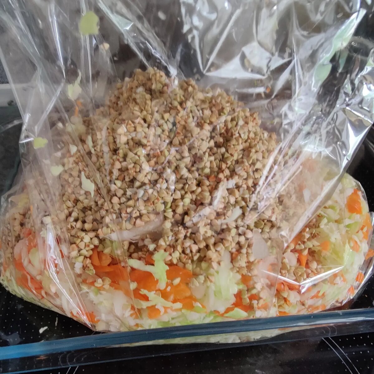 Кладём в пакетик зелёную гречку, шинкованные капусту, морковку и лучок, зубчики чеснока, специи( без соли) , хорошее настроение( можно прекрасное). Заливаем водой и ставим в духовку на 200° , на один час. По готовности оставить " дотомиться" и потом есть с большим аппетитом и наслаждением!