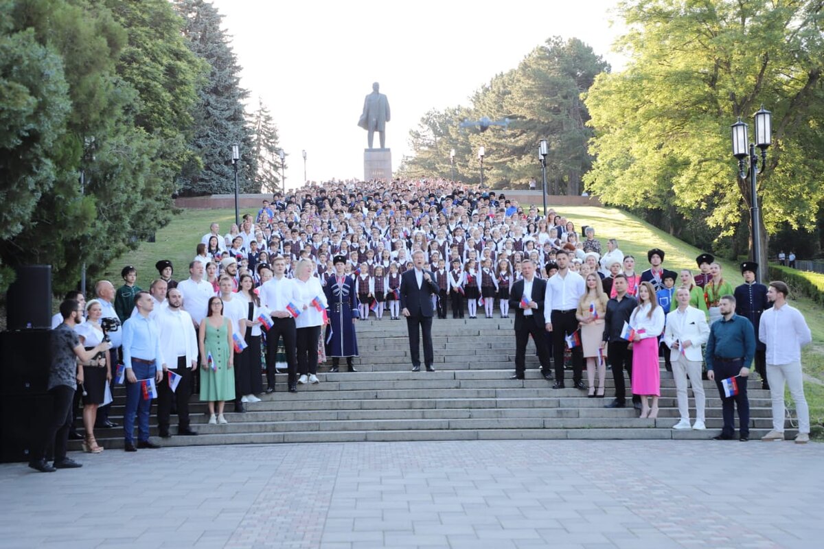 Вокалисты народного ансамбля «Хуторок», школьники и студенты, коллективы учреждений образ ования и культуры, сотрудники МЧС и медики, делегаты от предприятий и общественных организаций, юнармейцы, казаки, молодежный актив города и представители национальных диаспор – ранним утром праздничного дня все они собрались в центре Пятигорска, на каменной лестнице, ведущей от главной площади к Вечному Огню, чтобы оригинально поздравить родную страну и всех ее жителей с государственным праздником. И совсем не важен здесь уровень вокального мастерства или опыт хорового пения, главное – слова и музыка звучат от самого сердца и, как сотни небольших ручейков, сливаются в единую реку – могучую и красивую. Народный артист России, полный кавалер ордена «За заслуги перед Отечеством» Лев Лещенко убежден: Россия была и остается мощным государством, о котором надо писать книги, снимать фильмы и петь песни. А патриотизм, по мнению Льва Валерьяновича, держится на трех китах: любви к семье, к малой ро