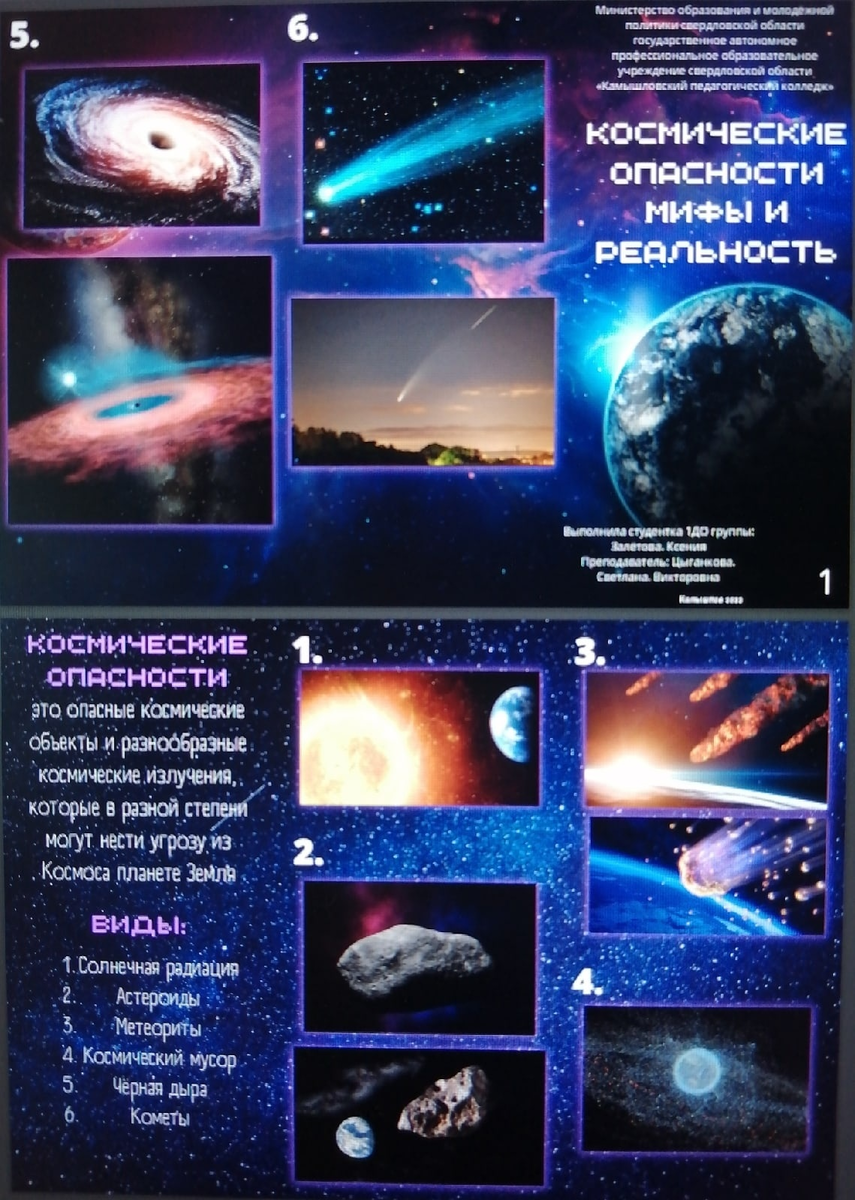 Продукт проекта-может быть как материальным (отчуждаемый от проекта), так и нематериальным (представлен в письменном виде). Результатом (продуктом) проектной деятельности может быть: письменная работа (эссе, рассказ, сказка, стихотворение, реферат, аналитические материалы, обзорные материалы, отчеты о проведенных исследованиях, буклет, словарь, пакет рекомендаций, справочник, заочная экскурсия, аннотация, рецензия, литературный календарь). Продукт проекта выбирается после того, как вы с руководителем выберете тему вашего проекта. Продуктом моего проекта был буклет: 1) Космические опасности, мифы или реальность (обобщающий) 2) Космический мусор 3) Солнечная радиация 4) Астероиды 5) Чёрная дыра 6) Кометы Работу сделала в преложение canva