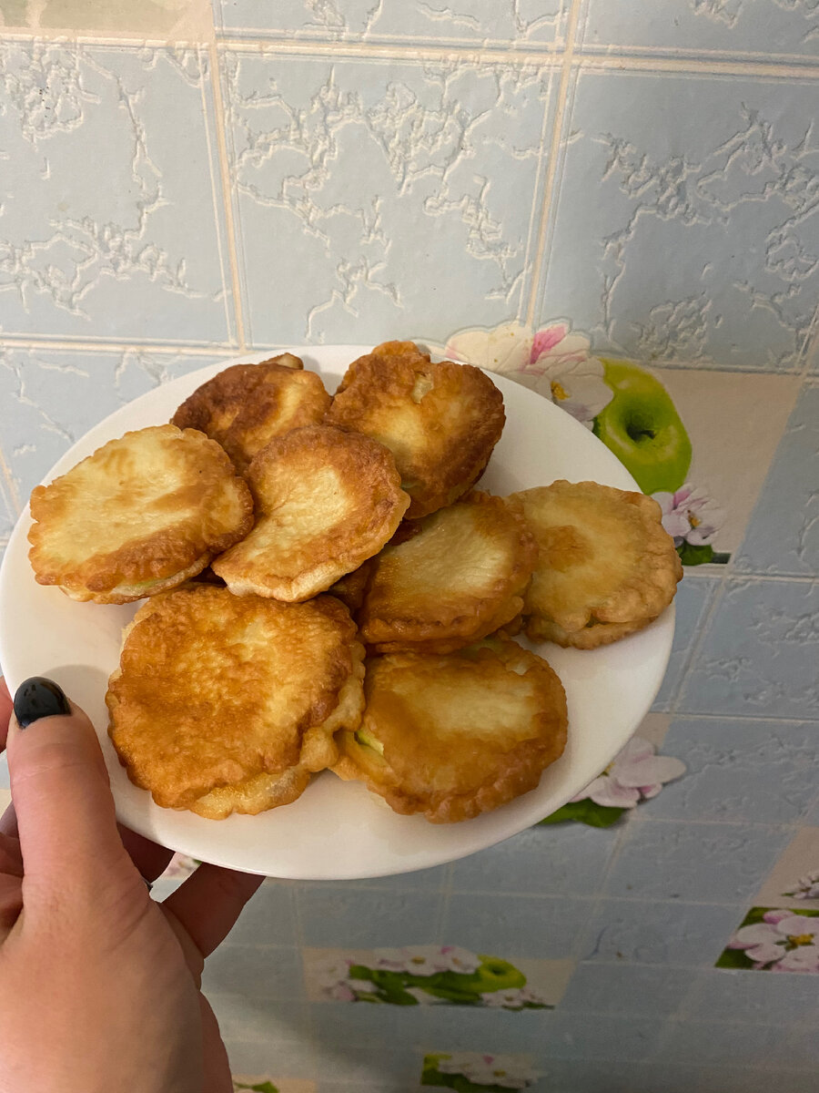Все перемешать, кляр готов. Кабачки порезать кольцами примерно 5-6 мм, обвалять сначала в муке, затем в кляре и жарить с обеих сторон в сковороде с подсолнечным маслом.