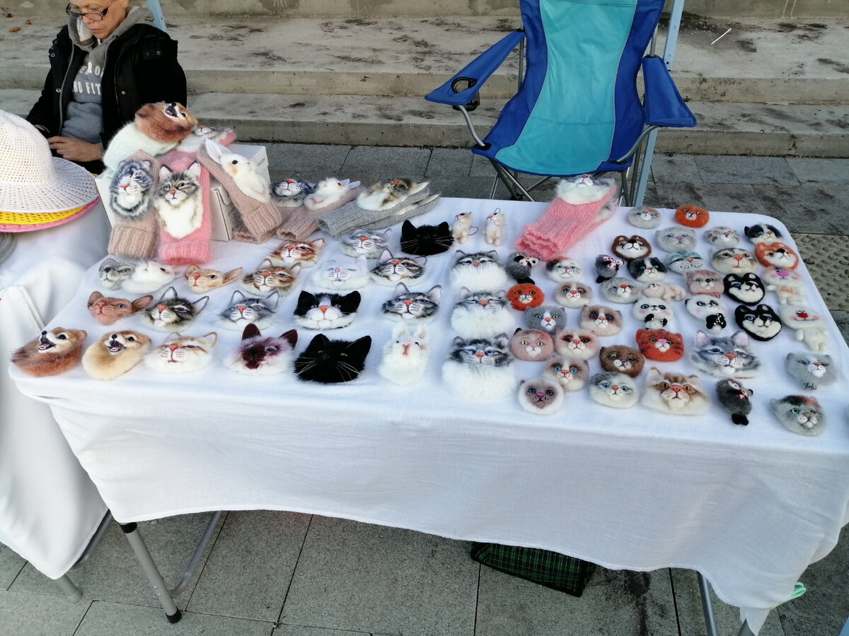 Вчера был день города, и, конечно, ярмарка! Велено было прибыть с палатками, потому что предполагался дождь. Я дисциплинированный мастер, хоть ярмарка от меня в двух кварталах всего, я попросила знакомого таксиста увести меня с этой бандурой, еле влезла в машину, пришлось сиденье опускать. В фото шатер не влез, только около стула ножку видно. Общими усилиями мы это чудо установили, порывы ветра пытались его опрокинуть, а закрепить на плитах его никак, в общем когда пошел дождь все сбились под шатер и дружно его держали. Я одна заморочилась с укрытием, больше никто палатки не принес. А дождь все лил и лил, настроение падало, конца и края туче не было, стало холодно, в общем загрустили мы... Спустя примерно час дождь закончился, и начался праздничный концерт, я сбегала в кафешку рядом, взяла горячий кофе, а тут и солнце вышло! В общем я согрелась, обсохла, разложила свои брошки-варежки, броши я пристегнула к скатерти, чтобы ветром не сдувало. После дождя народу было немного, но потом люд