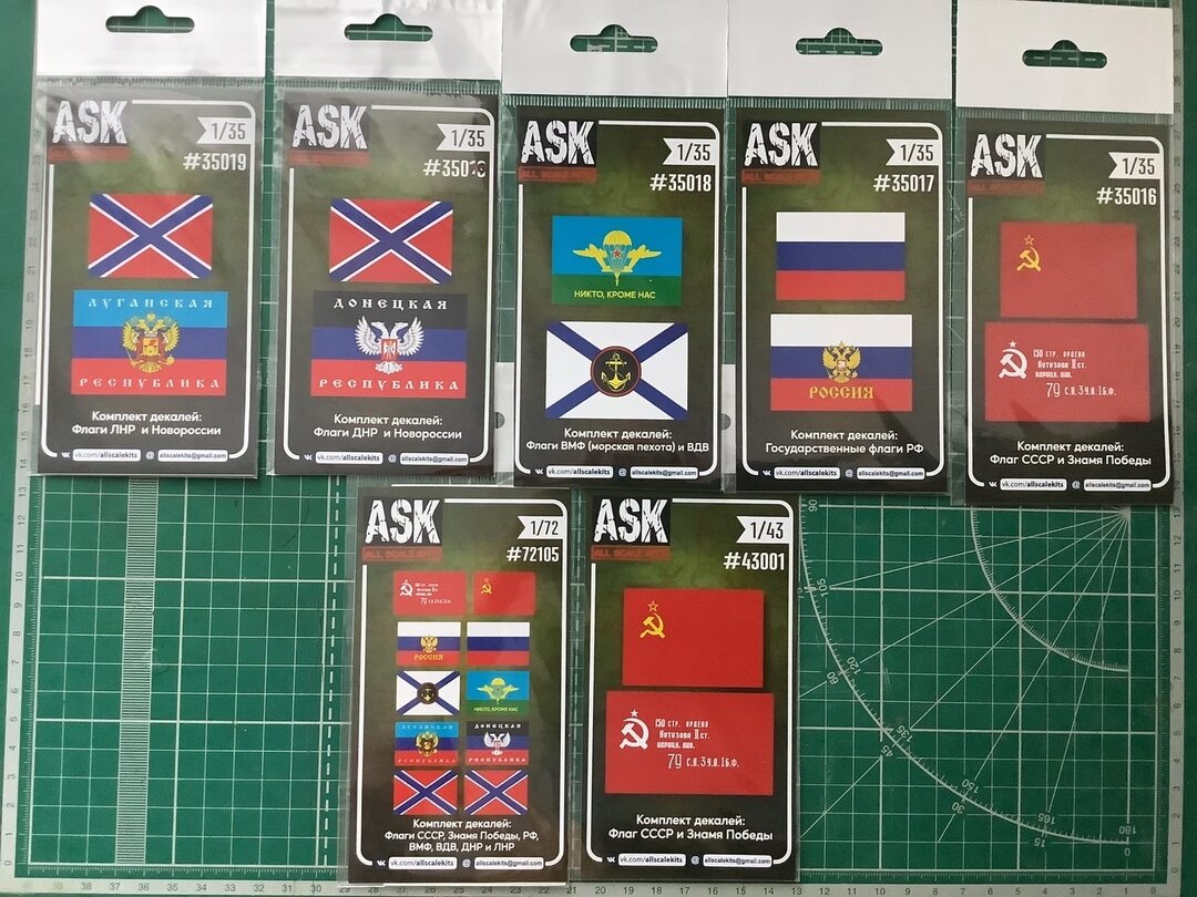 Всем привет, друзья. Только мы с вами проговорили, что отечественные производители ничего не выпускают по тематике СВО, как мне сразу в личку полетели сообщения с опровержением. Первыми из производителей на меня вышли ASK (All Skale Kits) со своей коллекцией декалей флагов. Ну что же, давайте-ка посмотрим что тут у нас.