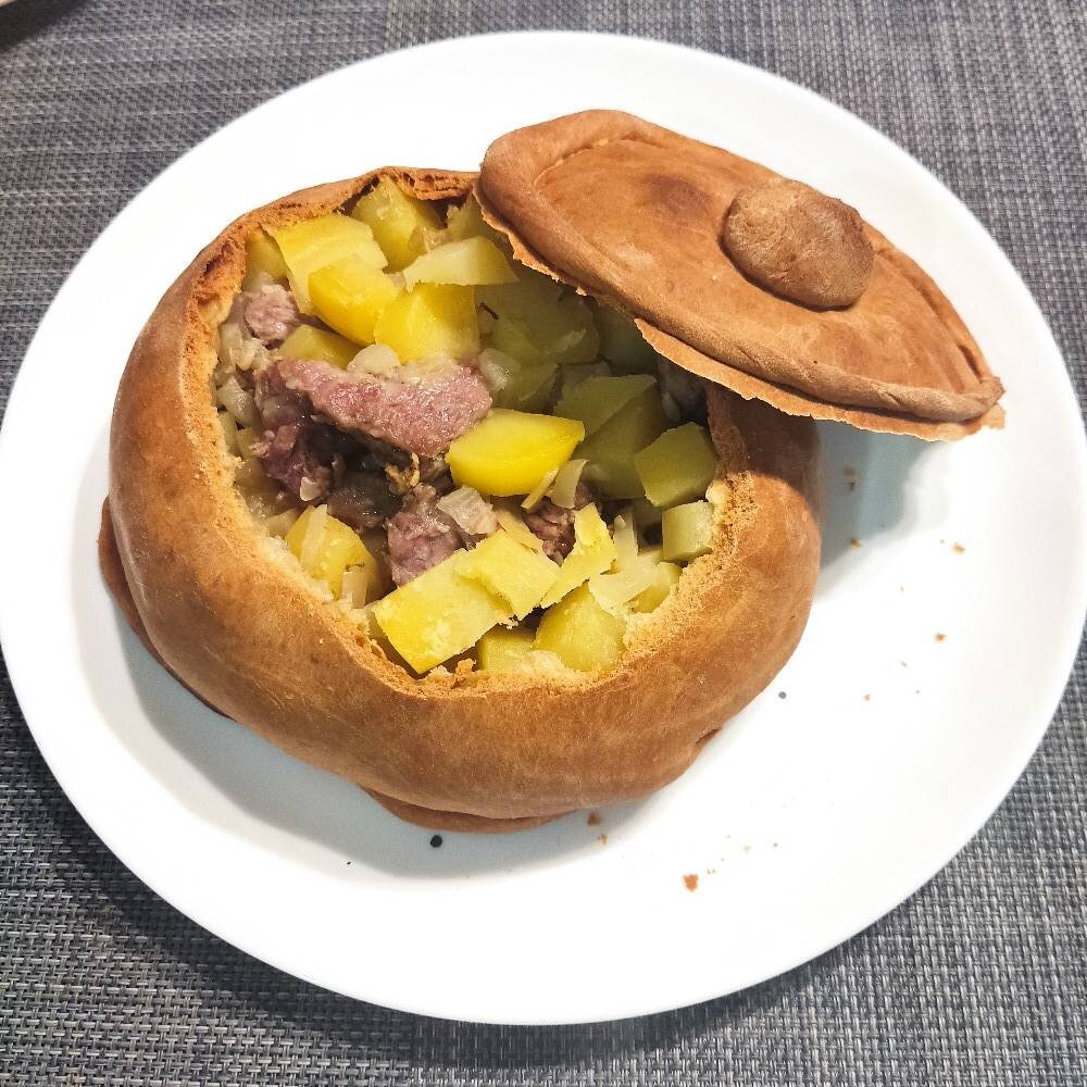 Ингредиенты: Тесто:, яйцо, кефира, соли и сахара, гр муки, соды, ст.л.растит.масла, Начинка:, средние картофелины, репчатый лук, гр говядины не жирной, зубочка чеснока, по вкусу Соль, приправы Способ приготовления: Готовим тесто: Смешиваем все ингредиенты и замешиваем мягкое тесто, которое не липнет к рукам. Убираем в пакет и оставляем отдохнуть тесто на 30 мин- 1 час. Готовим начинку: Все ингредиенты режем кубиком, размером 0.5 х 0.5 см. Солим, добавляем приправы по вкусу, перемешиваем и оставляем промариноваться на час. Собираем горшочки: Тесто делите на две равные части (если хотите горшочки меньшего размера,то делите тесто на большее кол-во частей). Каждую часть теста раскатываете в тонкую лепешку (в среднем,диаметр 10-15 см). Выкладываете тесто в глубокую форму(я использовала суповую тарелку с высокими ровными бортами), в середину тесто выкладываете начинку (много) и скрепляете края лепешки по принципу мантов (сверху соединяете все края. Крепко, чтобы не было отверстий и порванных