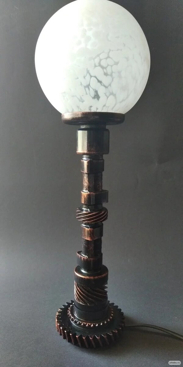 Но очень уж мне нравится такая форма. Самое сложное в данной работе было испортить книгу просверлить вал и придумать название. Но токарь справился с первым, а я со вторым. Шестерня из коробки передач, москвичёвский вал и плафон от преждевременно почившей (не без моей помощи) люстры.